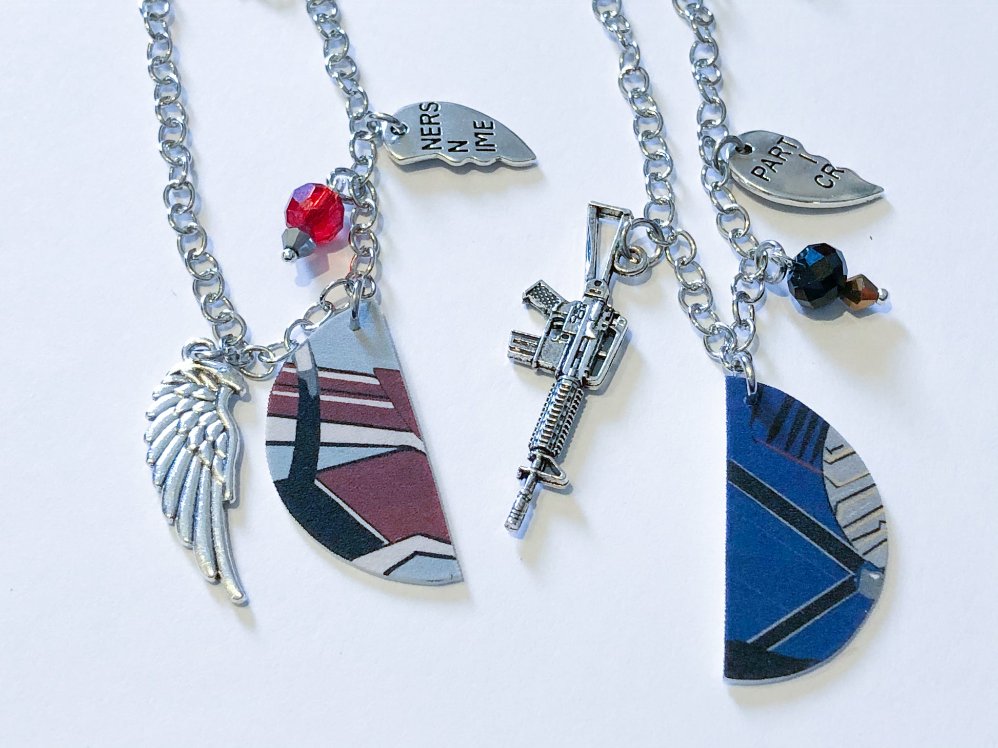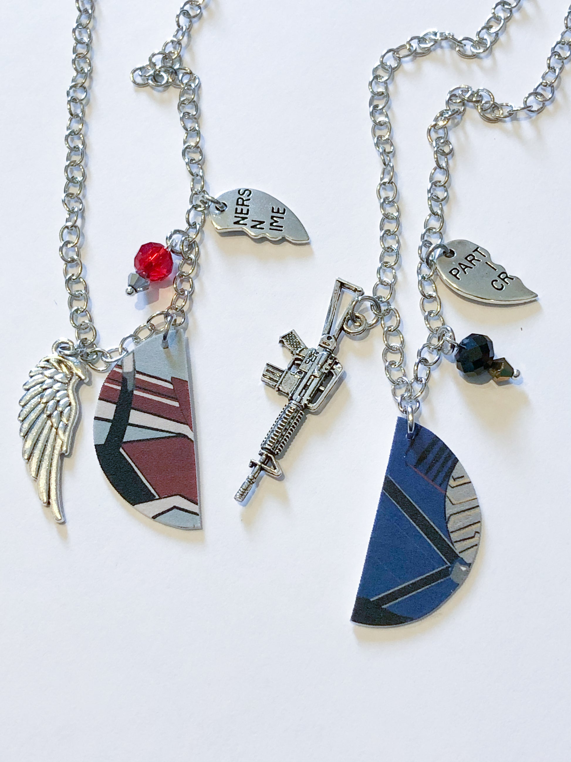 I was trying to play around with the perfect design for my BFF necklaces so when I drew this design I thought it would be perfect. I added in partners in crime charm because oh boy are these two partners in crime or what? Anyway, the two charms go together for their outfits, and then I added beads in their colors along with a machine gun for Bucky and a Wing for Sam.
