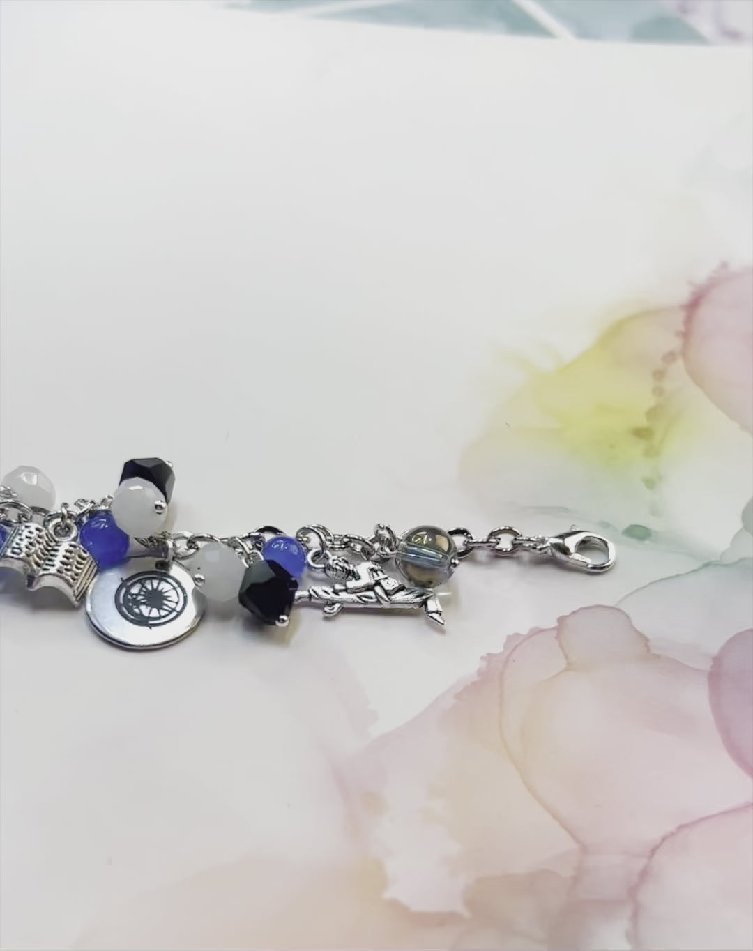 I love this show so much I'm bringing you a loaded bracelet with laser-engraved charms and lots of love went into this one. The middle charm is stamped with Akk and Ayan, the charms are a boat, a book, the logo of the school, Ayan's necklace, a karate guy ( for their lessons ), and a camera for the movie. The colors are black and white for their uniforms and blue for Akk's arm band.