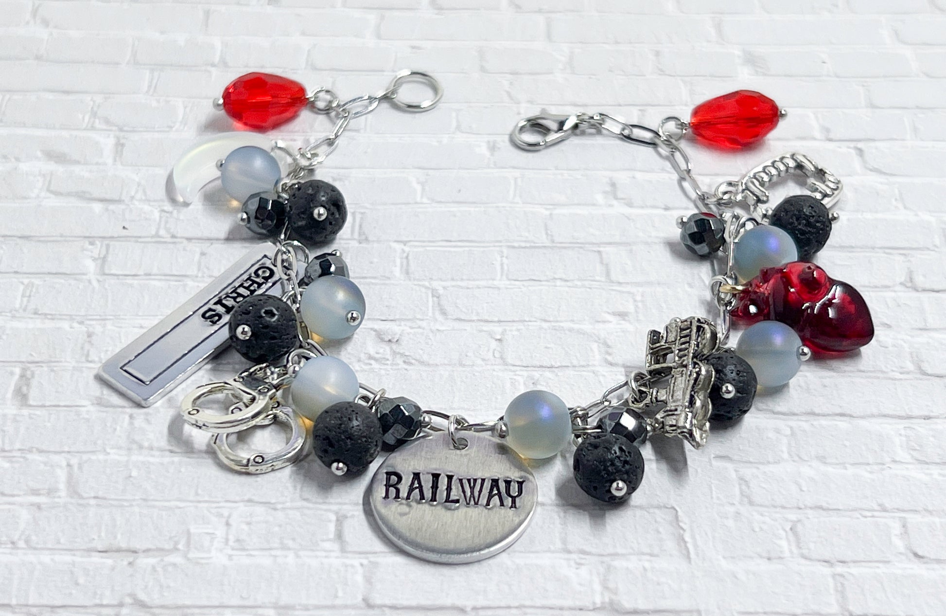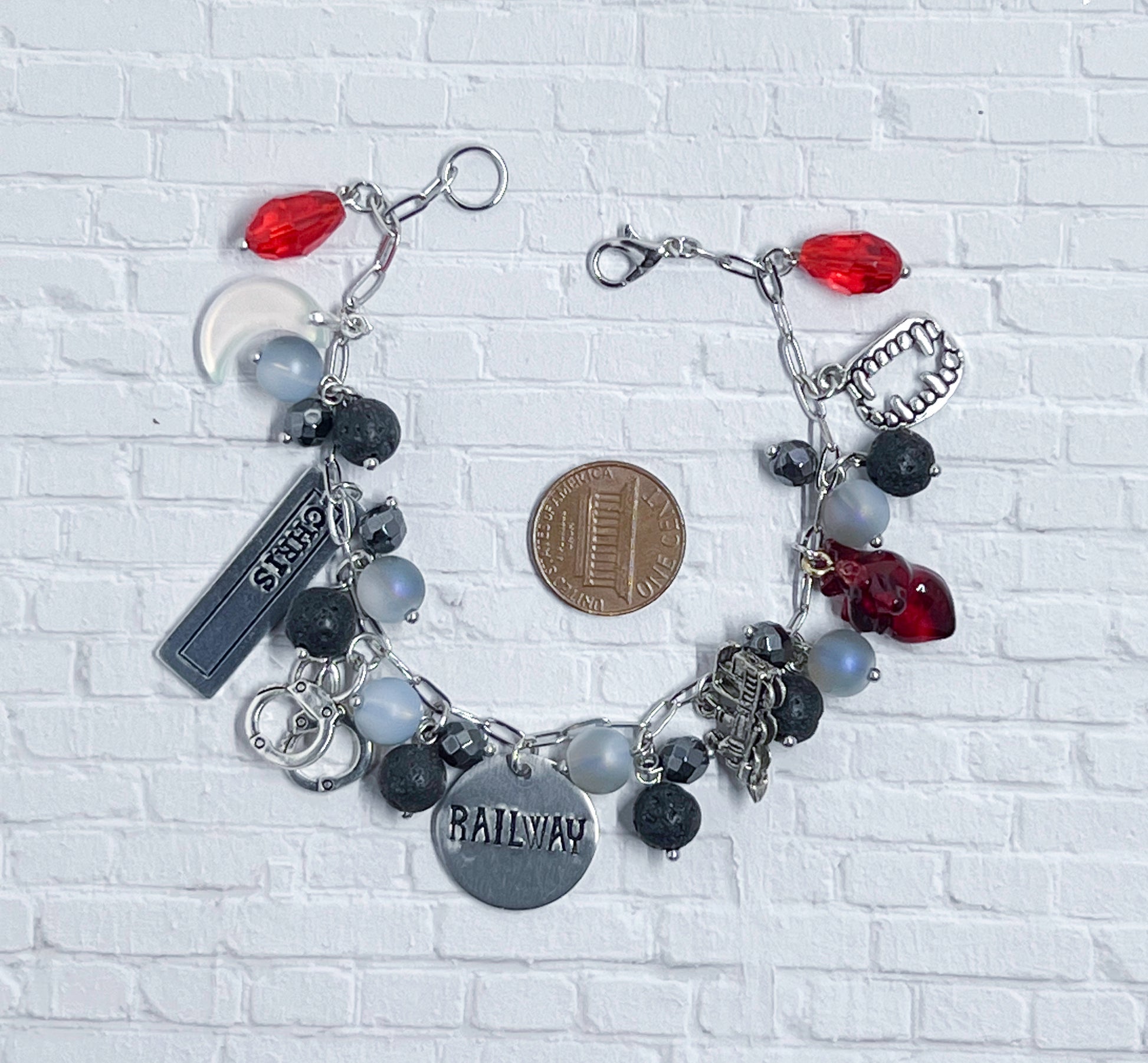 Inspired by Chan's solo song Railway. The bracelet has black, white and grey beads with the following charms: heart, train, fangs, handcuffs, a moon, and a stamping blank of his name.