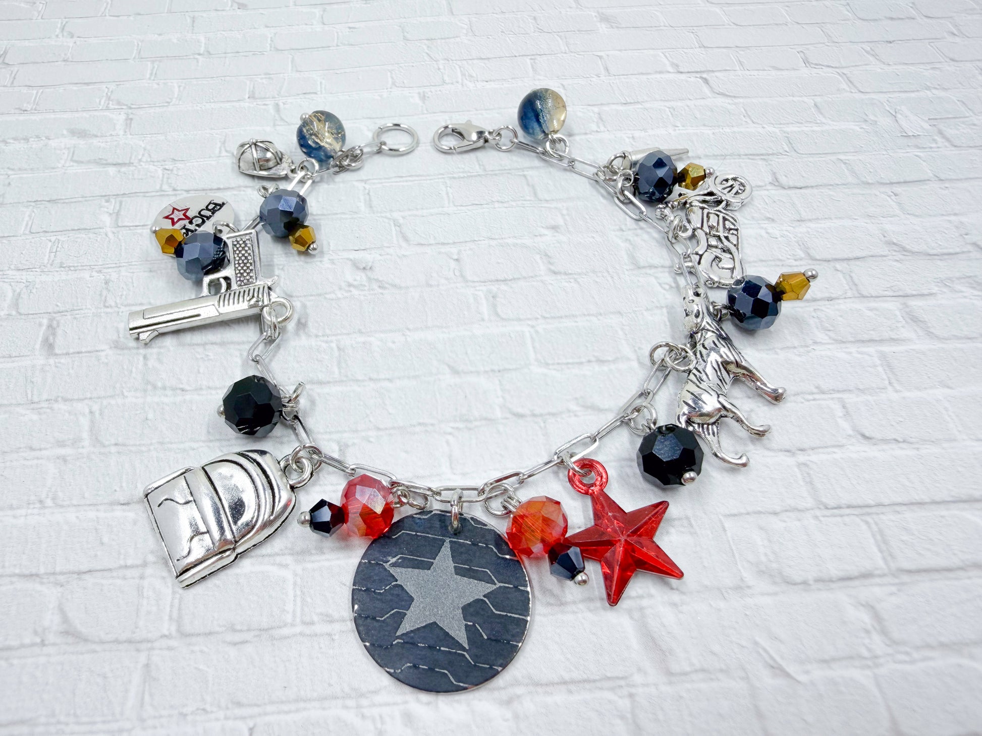 As with all of my bracelets, I like them to tell a story. This is my third version of Bucky's bracelet as his character keeps changing throughout the series. The bracelet starts with a laser-engraved charm for the Winter Soldier. I used red and silver here in the middle and a red star charm next, as Bucky was under their control after I switched over to black and gold for his new arm. The next charm is a wolf for his time as the white wolf, a motorcycle, and a bullet, on the other side, I have Bucky's backpack because that was the only thing he really owned for a while. Then a gun, a bucky charm with a star, and his hat.