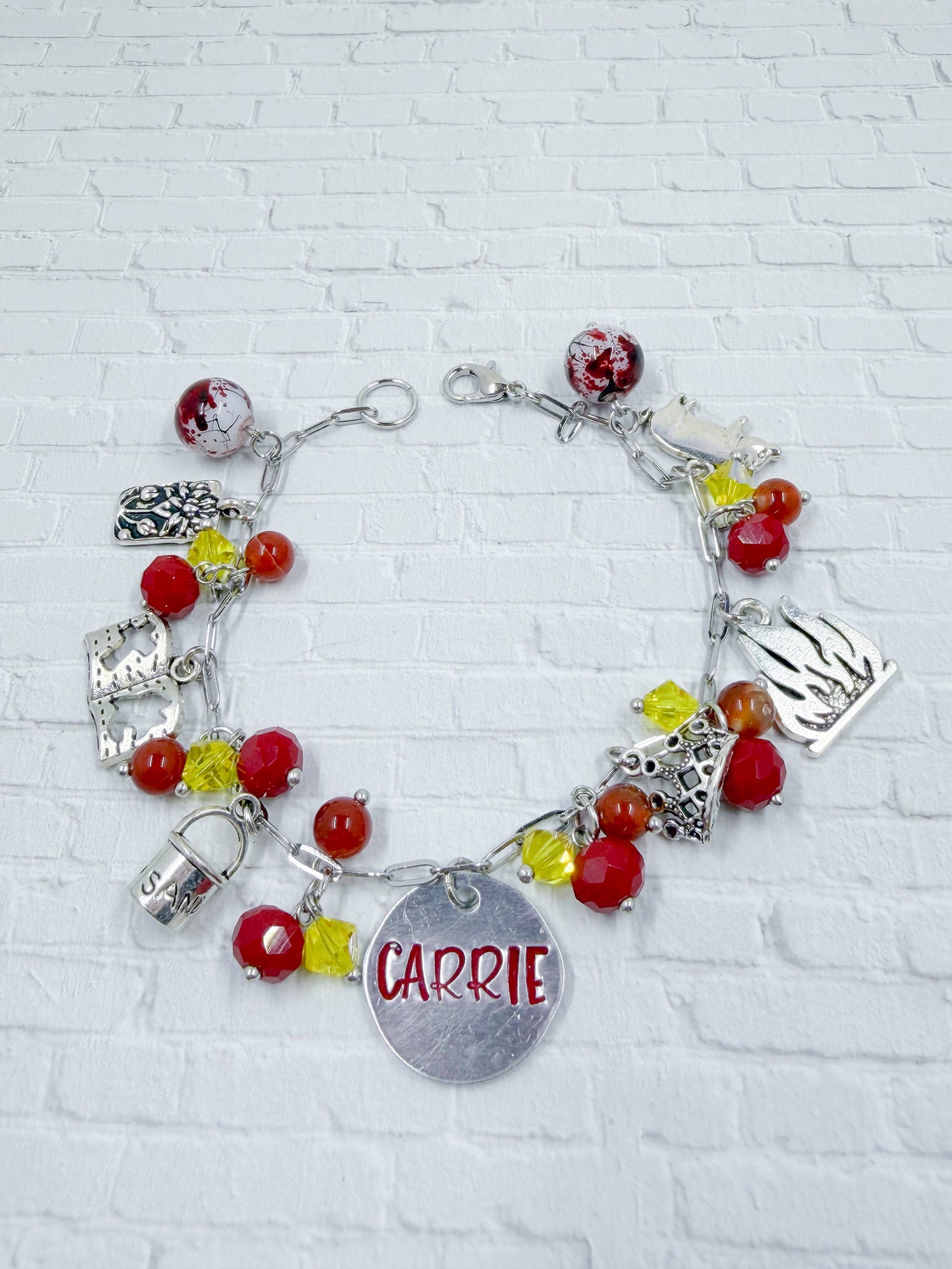 Inspired by one of cinema's most unforgettable moments, this bracelet celebrates Carrie's legendary story with charm and flair. Each bead glows in fiery hues, while the collection features symbolic charms—flickering flames, a sacred bible, an iconic bucket, a pig, delicate flowers, and her unmistakable crown. Perfect for fans who appreciate bold, theatrical style with a wink and a nod to the supernatural.
