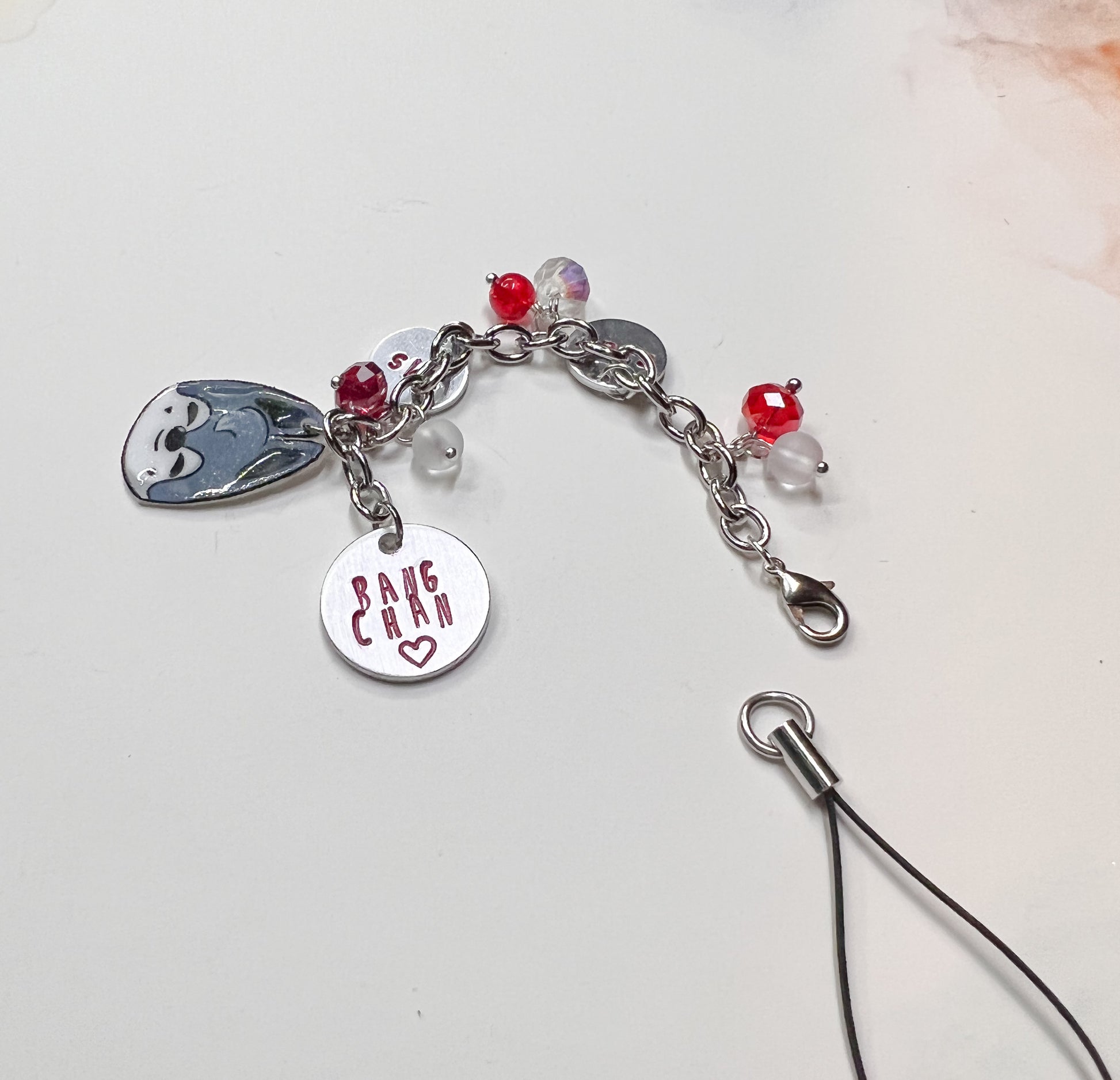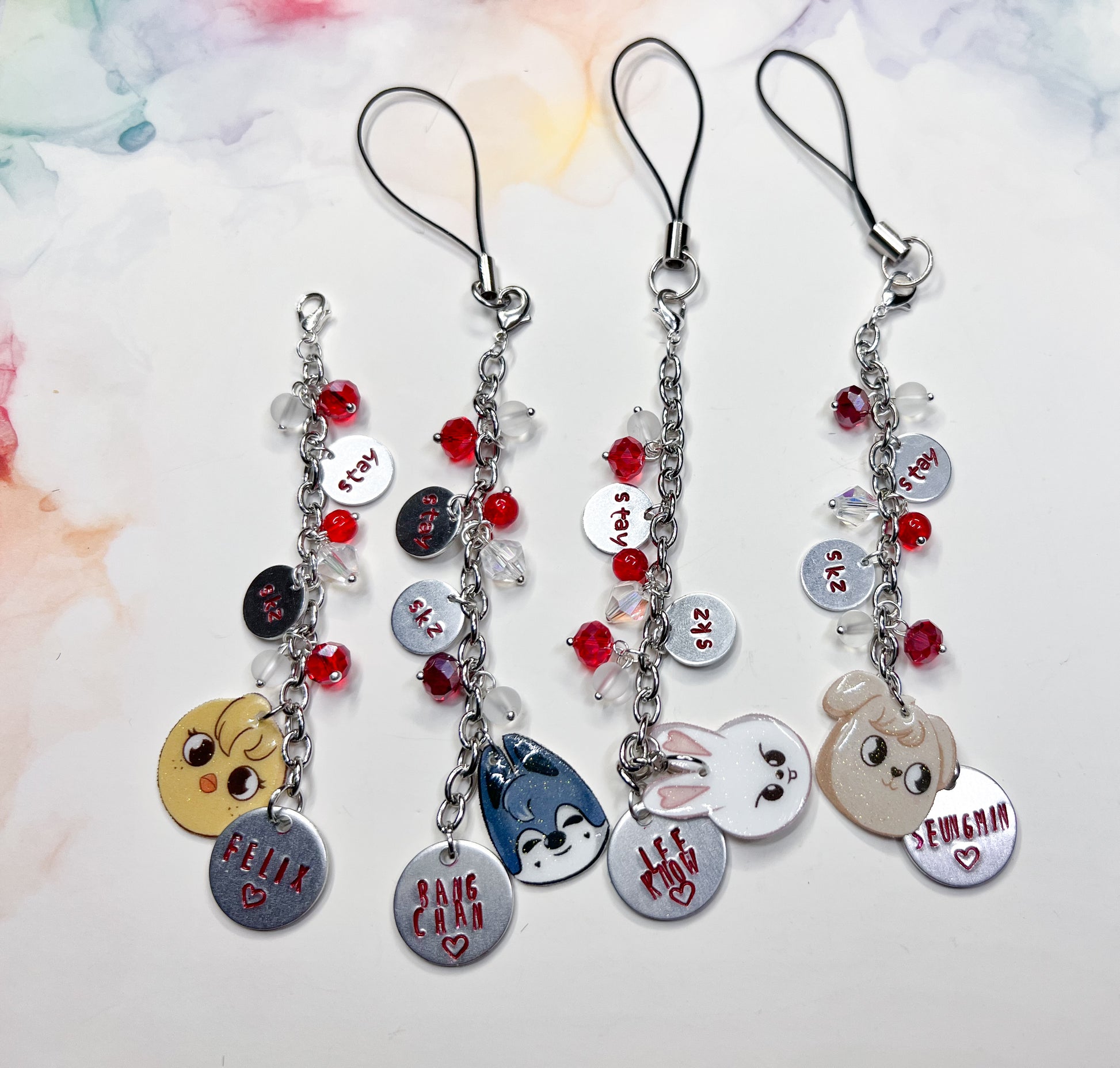 Step Out! Decorate your Stray Kids lightstick with a charm of your bias. The light stick charm is clipped onto a loop similar to the one that comes with your light stick for the wrist strap. The loop slides right through the hole where the wrist strap goes and you can fit both the wrist strap and the charm together