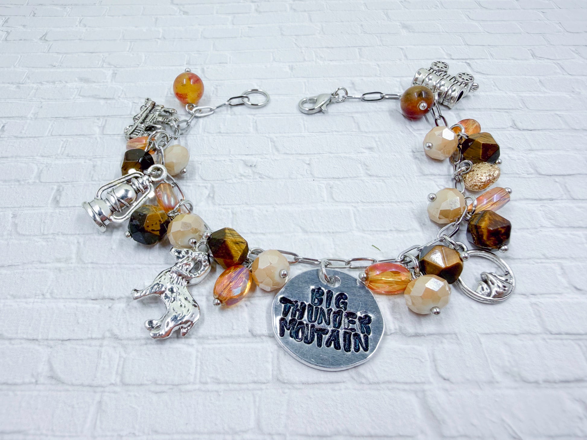 First up we have Big Thunder Mountain. This bracelet is adorned with beads in the color of the mountains and areas on the ride. We have the following charms: a train, a lantern, a goat, a mountain, a gold nugget and a carriage.