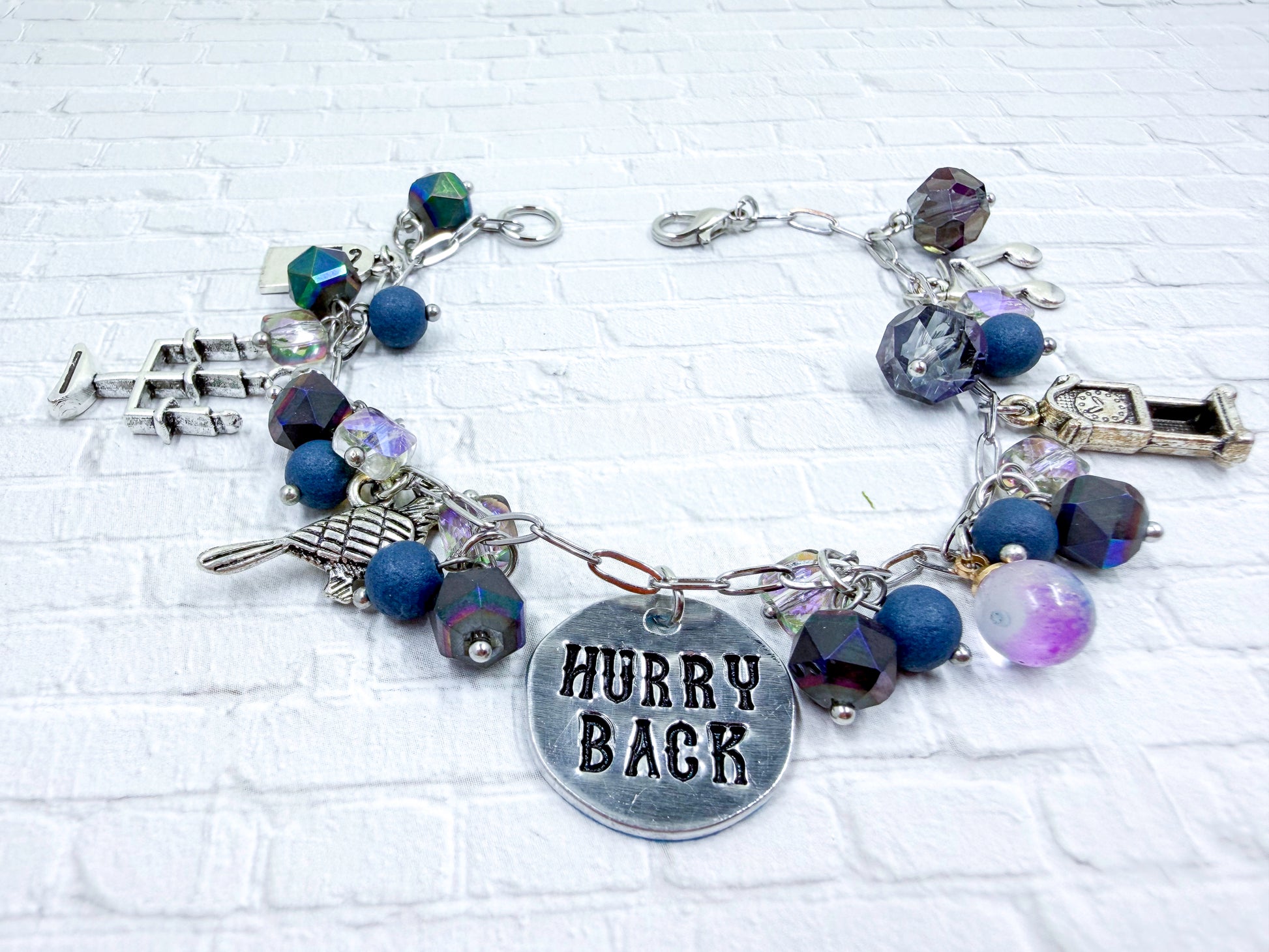Haunted Mansion comes alive with dark purples and iridescent crystals. The charms are a grave, a candlelabra, a raven, a crystal ball, a clock, and a music note.