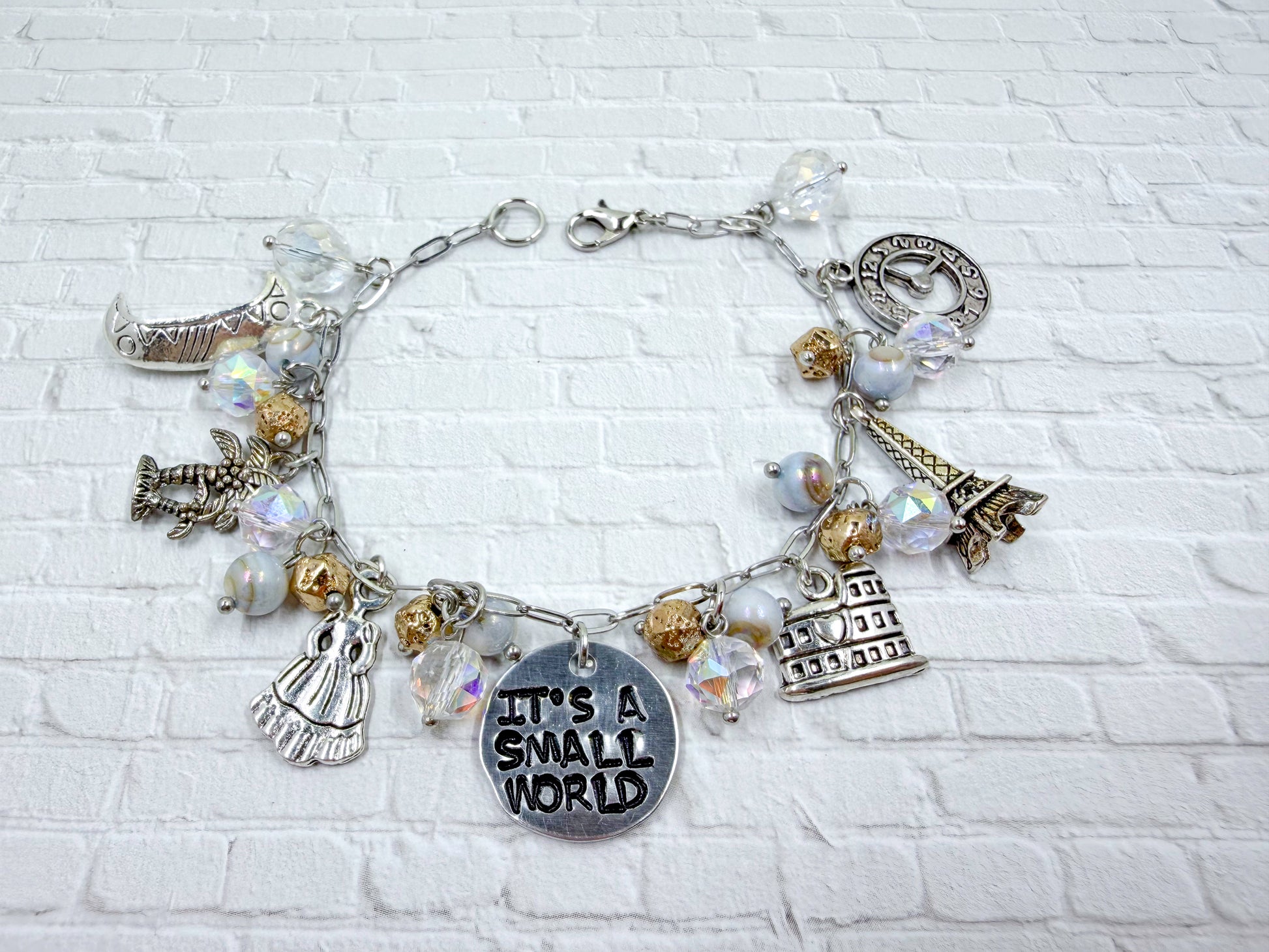 Small World, you either love or hate this ride, but you can't deny how pretty the colors are. We captured this as best as we could with gold, pearl, and irradiant crystals. The charms are a clock, a eiffle tower, a Roman building, a dress, a palm tree, and a boat for your ride vehicle.