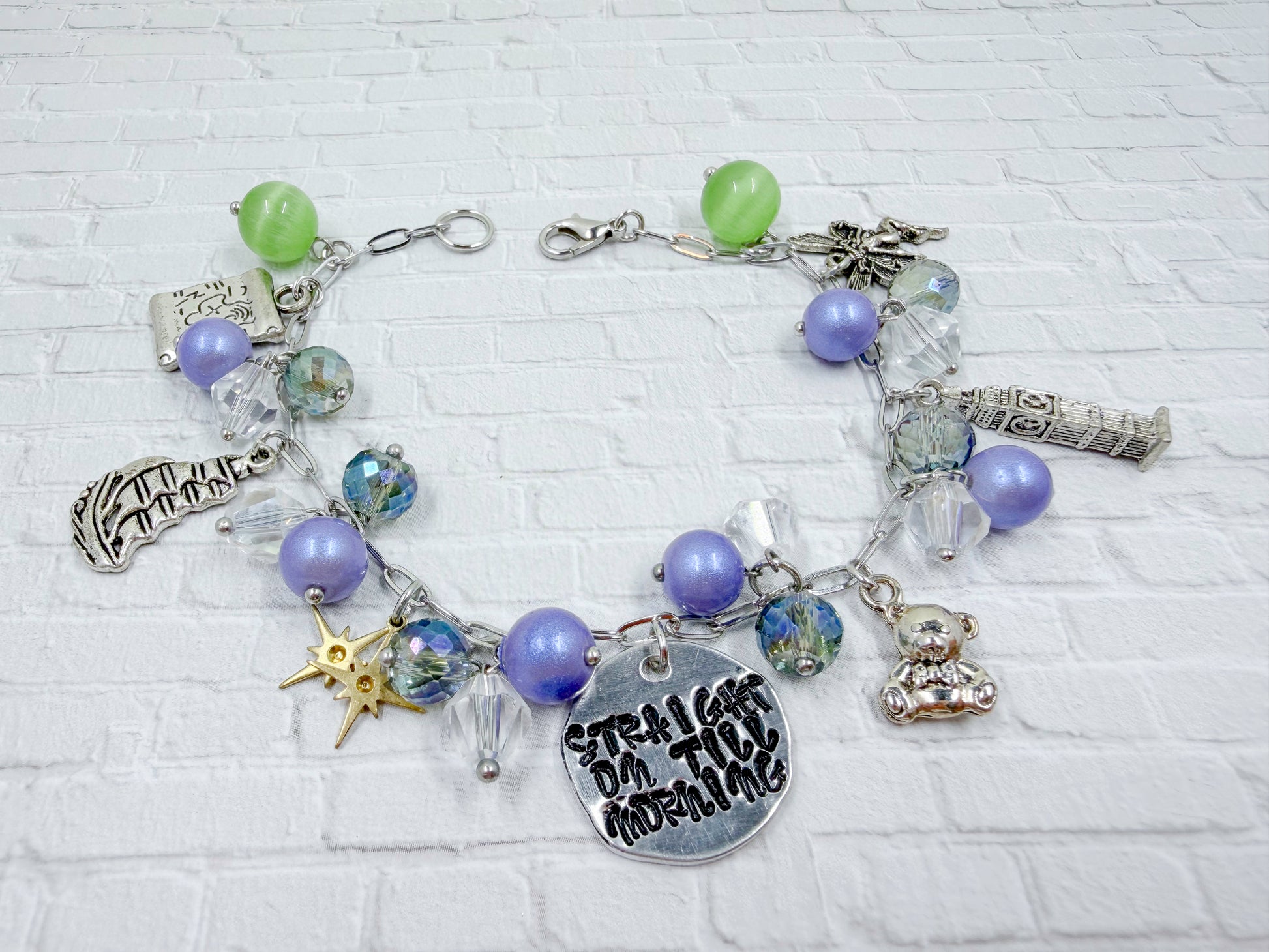 Flight of Pan we have purples, blues, and greens for this one, to match the night sky. The Charms are a ship, stars, a map, a London tower, a teddy bear, and a fairy.