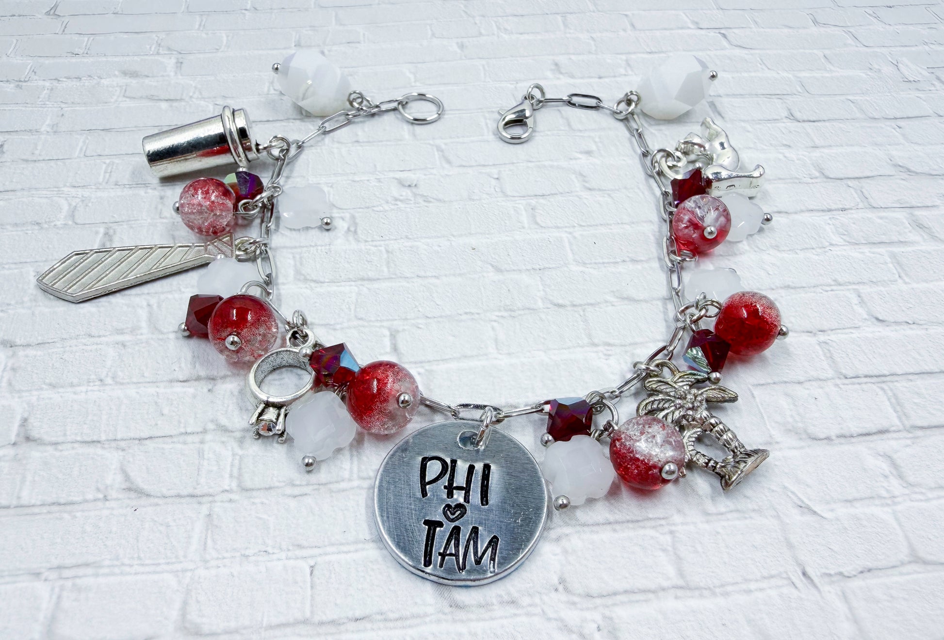 The colors are red and white, the charms we used are coffie, a tie, a ring, a palm tree, a camera ( its missing in the photo, but it will be on your bracelet) and of course a cat.
