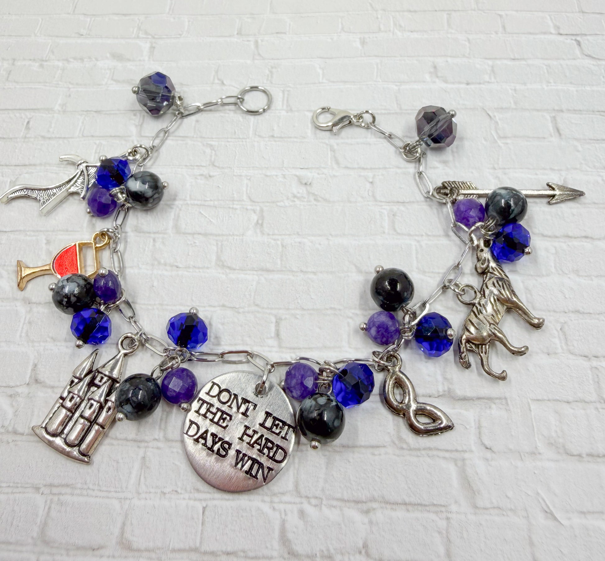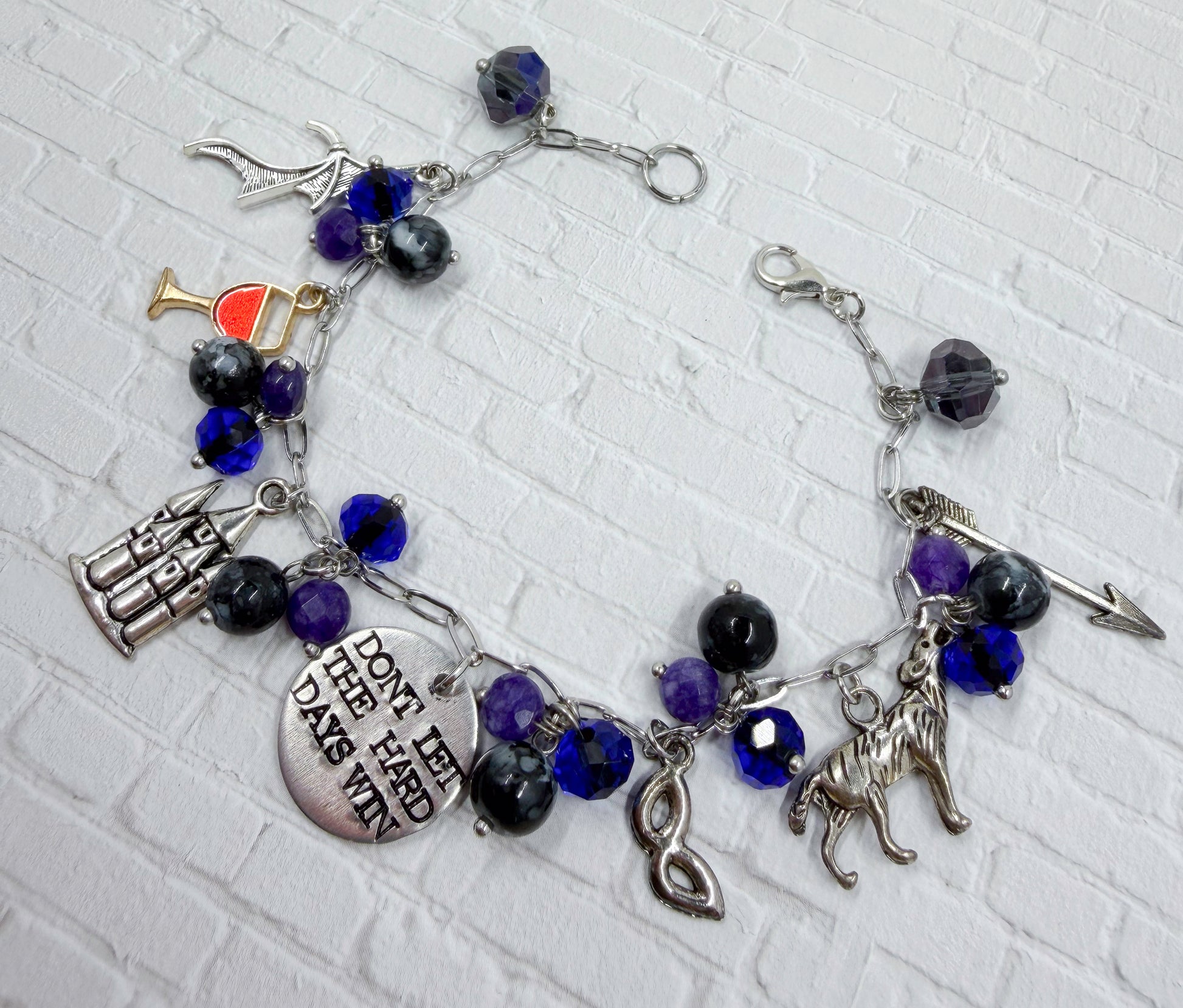 A perfect gift for fans of this series. The bracelet is made with a stainless steel chain. The charms are each perfect we have a wing, a castle, a wine glass, a mask, a wolf and an arrow. Ther colors are purples, blue and grey black.