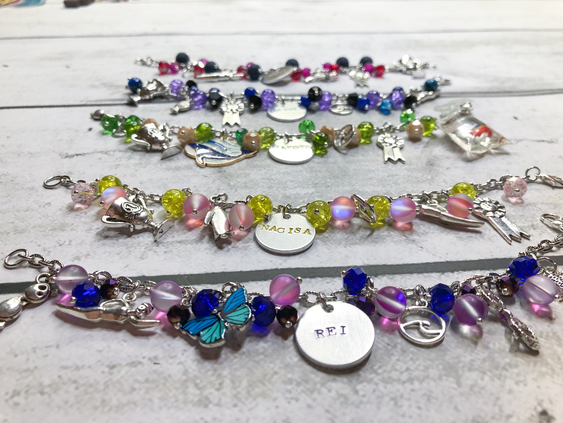 I made the Free Iwatobi Swim Club characters each into a loaded bracelet I wanted to spend a special time on each bracelet. Each one tells a story of the character and the shrink charms are all coated in UV Resin. Every bracelet had their names in the colors stamped by me, and an ocean charm. I take custom orders