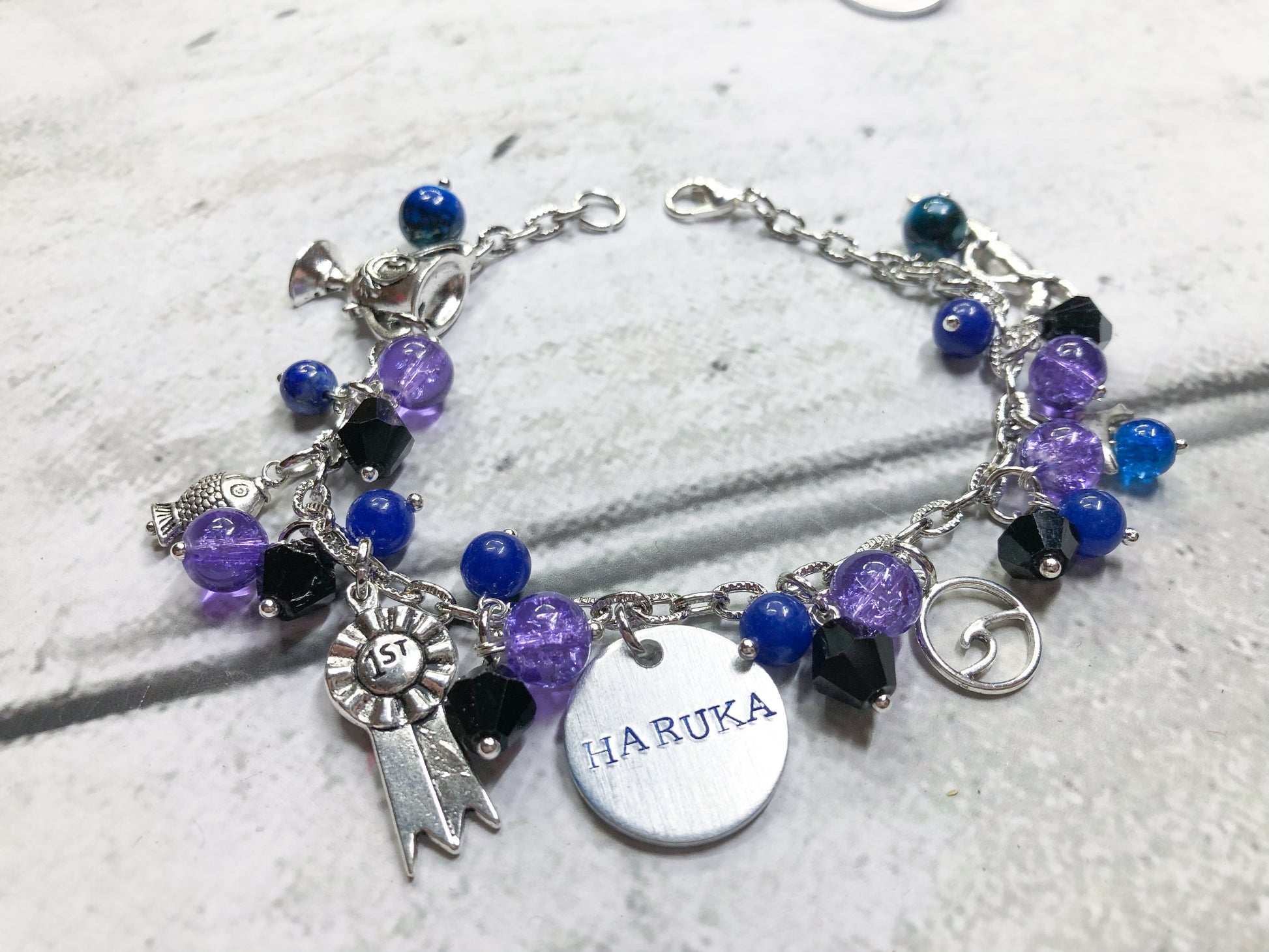 Haruka - His beads are purple black and blue, his charms are a trophy, fish, ribbon, water, dolphin, and swimmer.