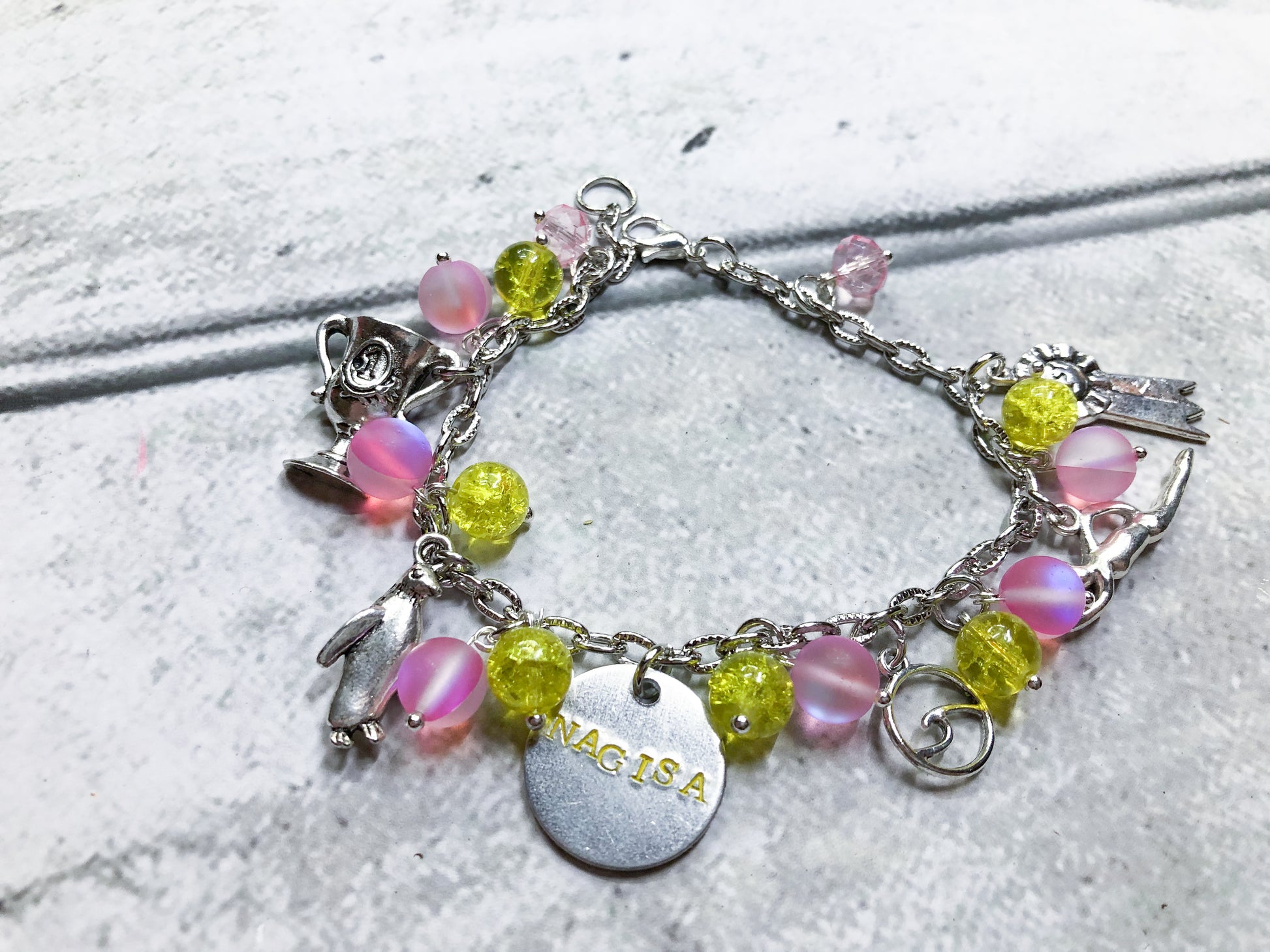Nagisa- his beads are pink and yellow his charms are a trophy, a penguin, wave, swimmer, and ribbon.