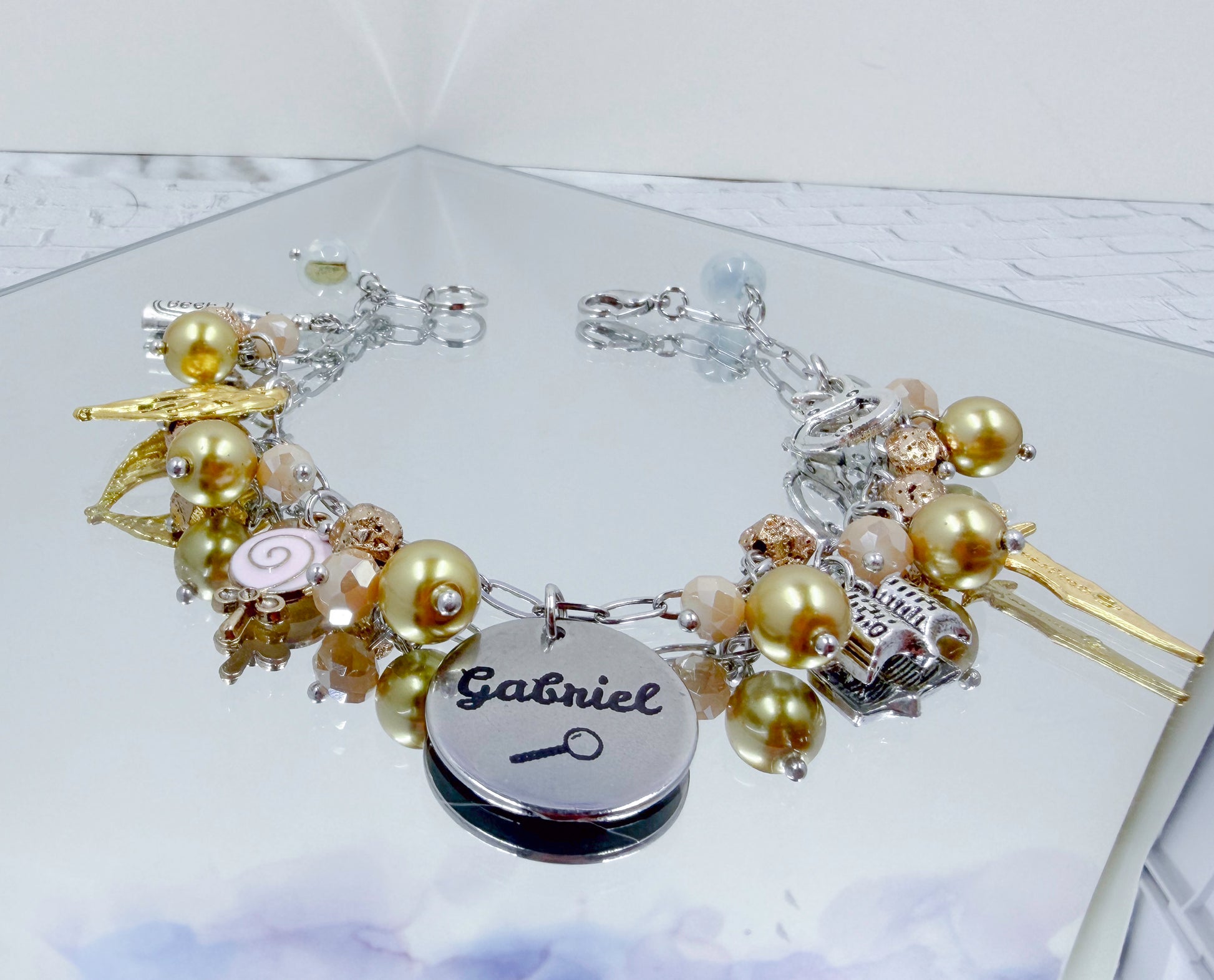 Celebrate the trickster angel with this Gabriel-inspired charm bracelet! Crafted with shimmering gold tones that capture his essence, this piece features symbolic charms representing his most iconic moments—a lollipop for his mischievous side, a beer bottle for his love of indulgence, a book for his intellect, delicate wings for his celestial nature, an angel blade for his warrior spirit, and handcuffs nodding to his darker chapters.