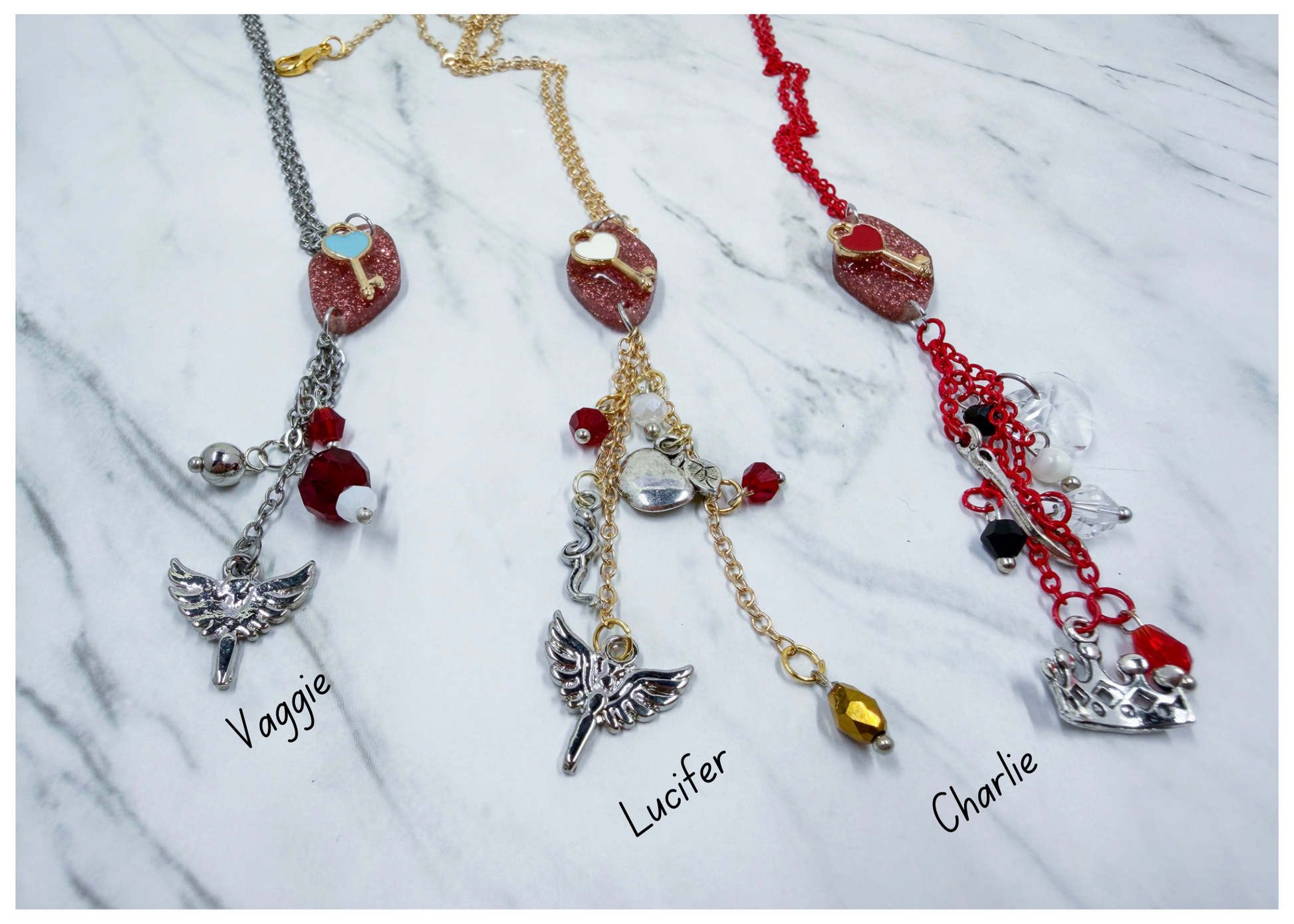 I have had this idea since the first season. These are key necklaces for each character. I went with the idea of an older hotel key design mixed with beads and charms for each character. All necklaces are made with stainless steel chain and findings; the charms are not stainless steel.