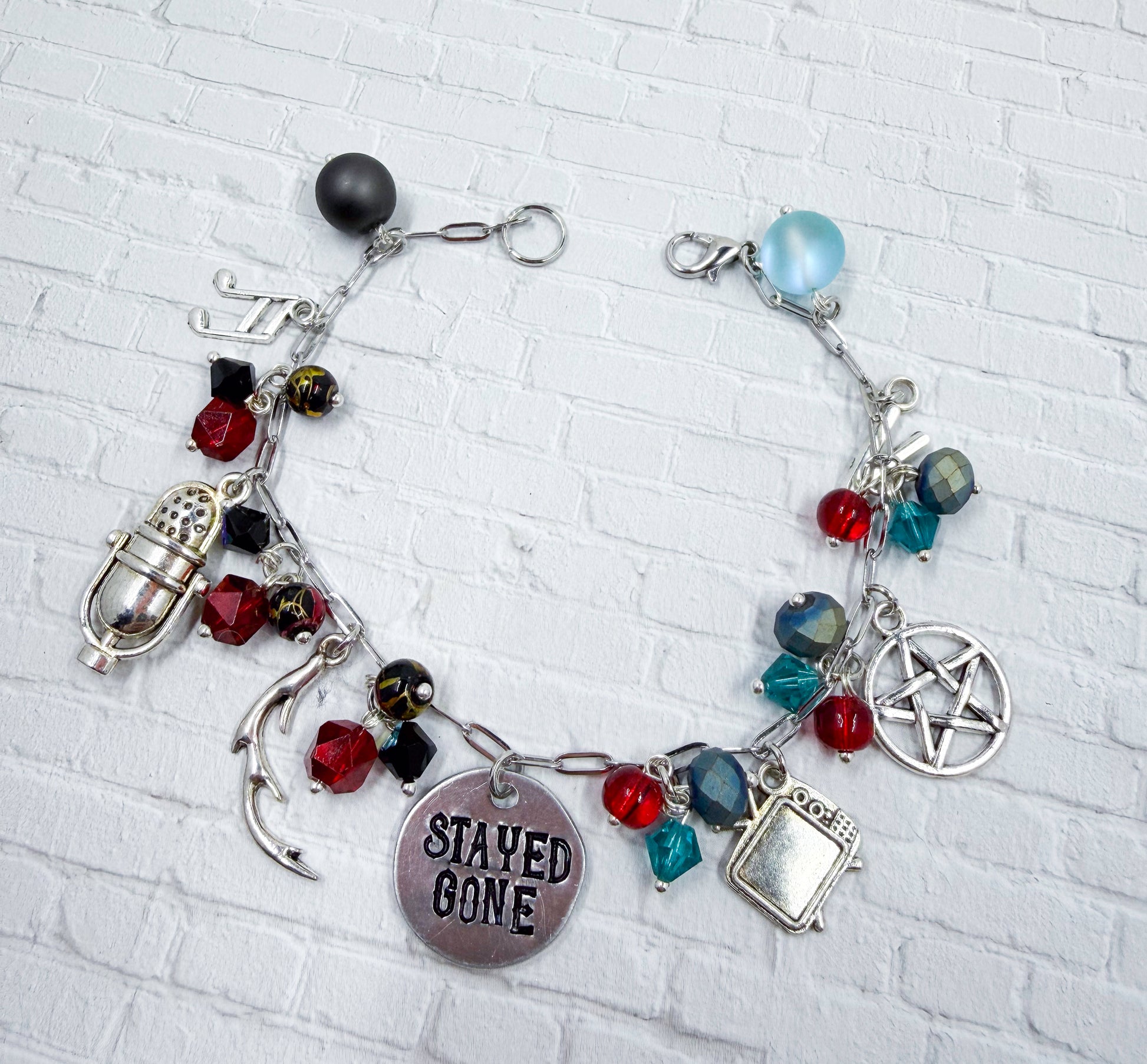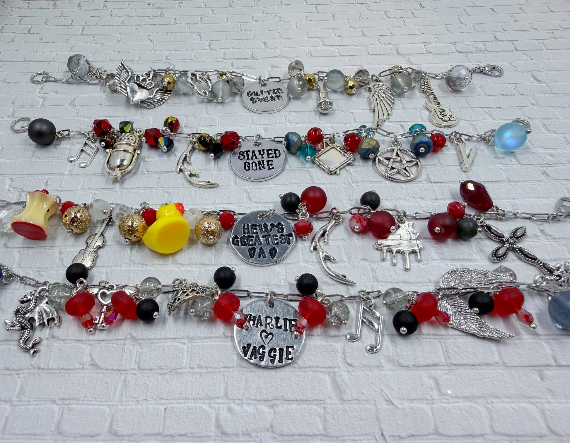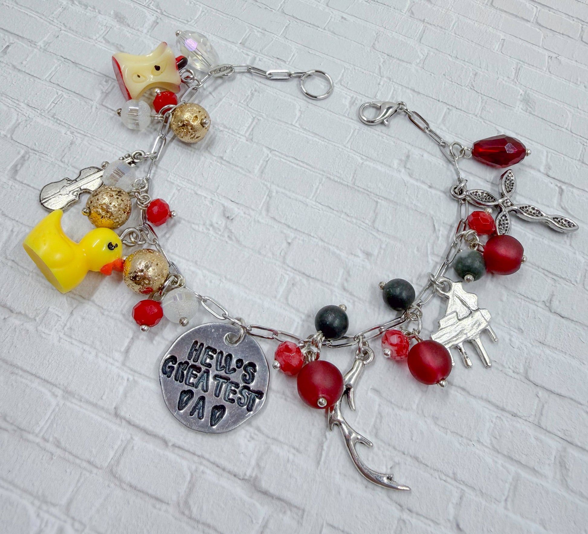 Hell's Greatest Dad ( Alastor and Lucifer ) Gold and White for Lucifer, Red and black for Alstor. Charms are, apple, violin, duck, altler, panio, and cross ( for nun alastor )