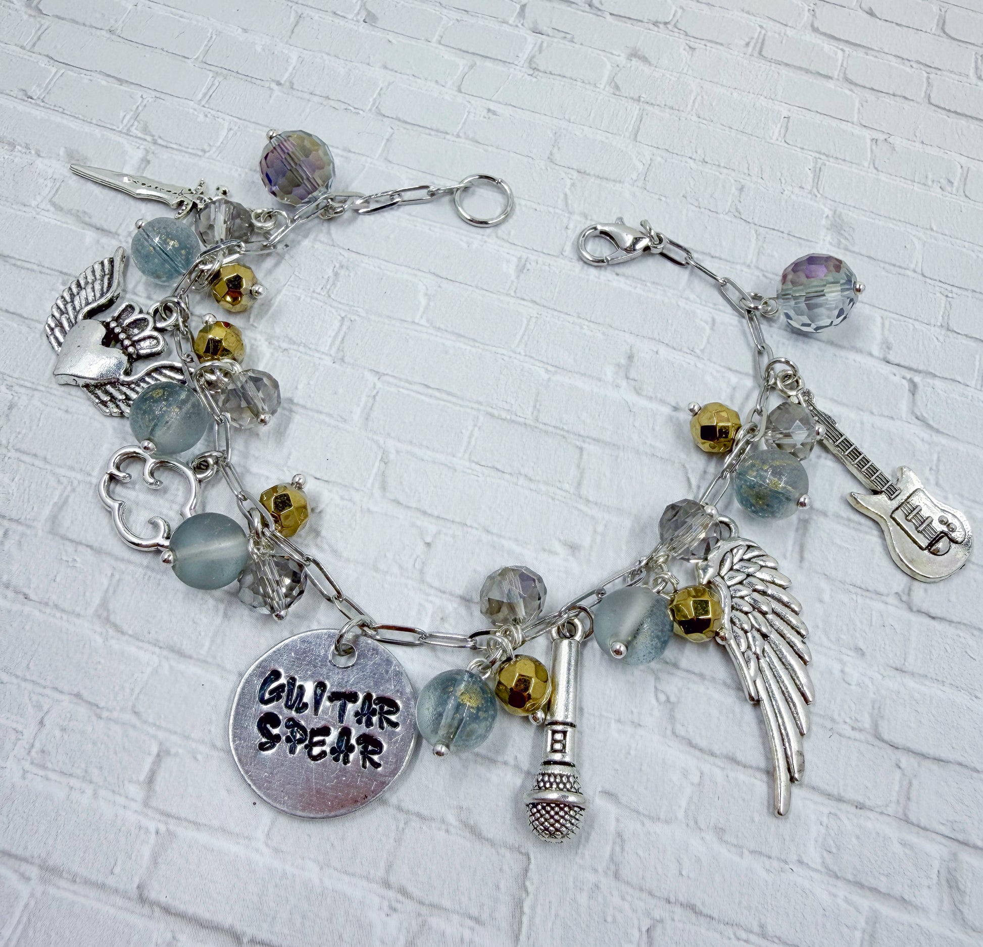 Guitar Speak ( Lute and Adam ) Slivers and golds, charms, sword, wings, cloud, mic, heart wings, guitar.