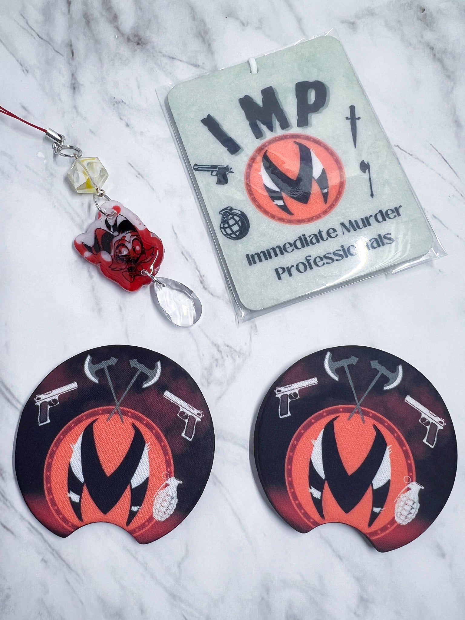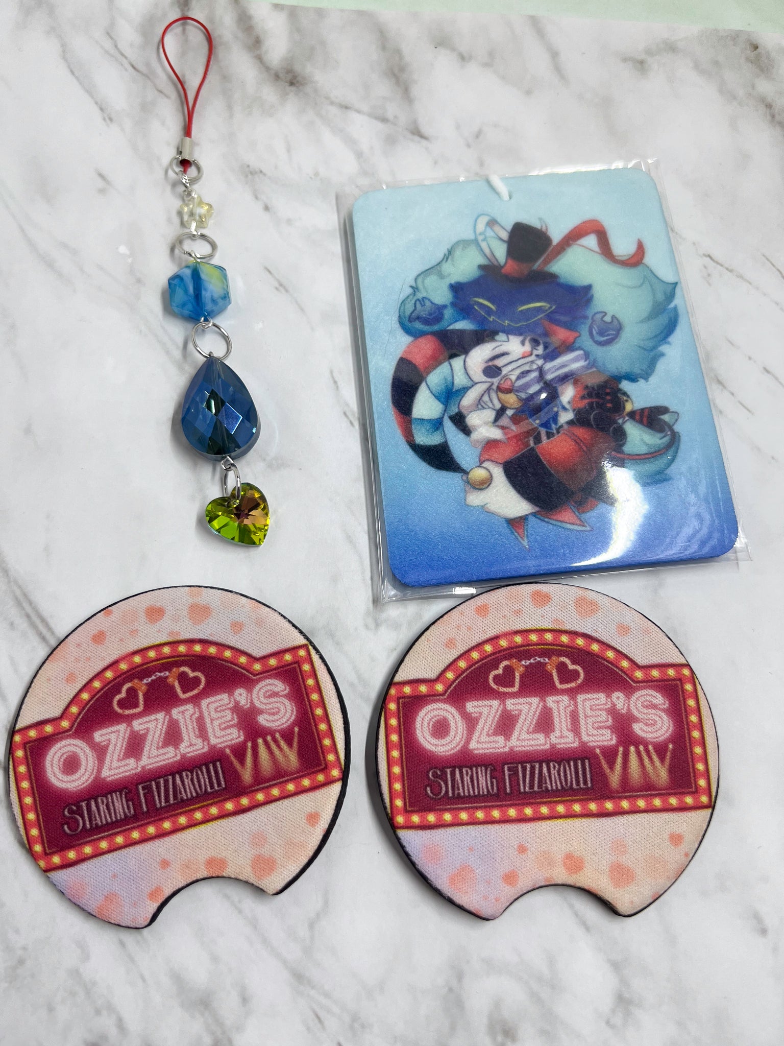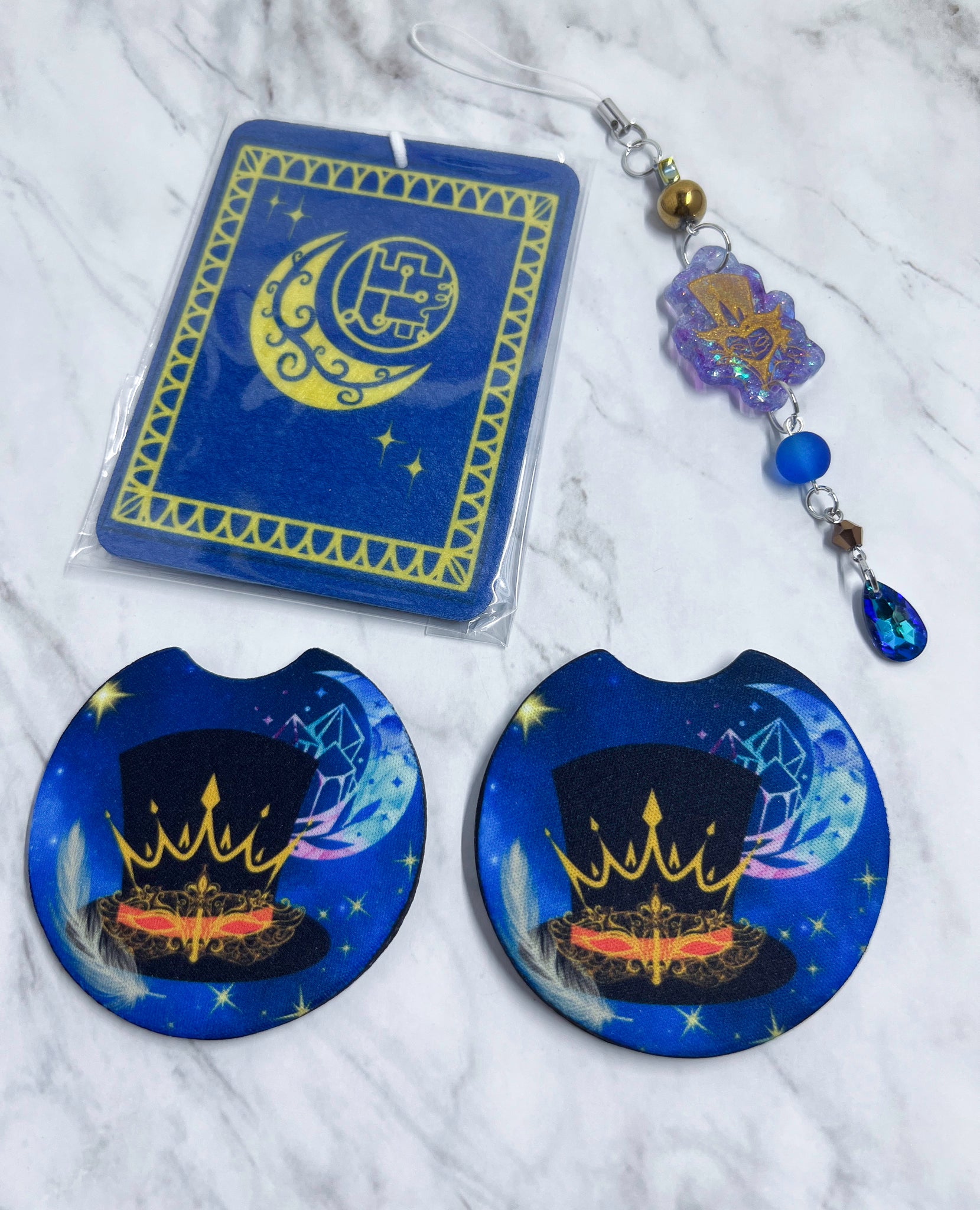 Car Kits, come with two coasters for your car, an air freshener ( you can spray on your scent they are unscented until I have scent options in the future.), and a review mirror dangle.