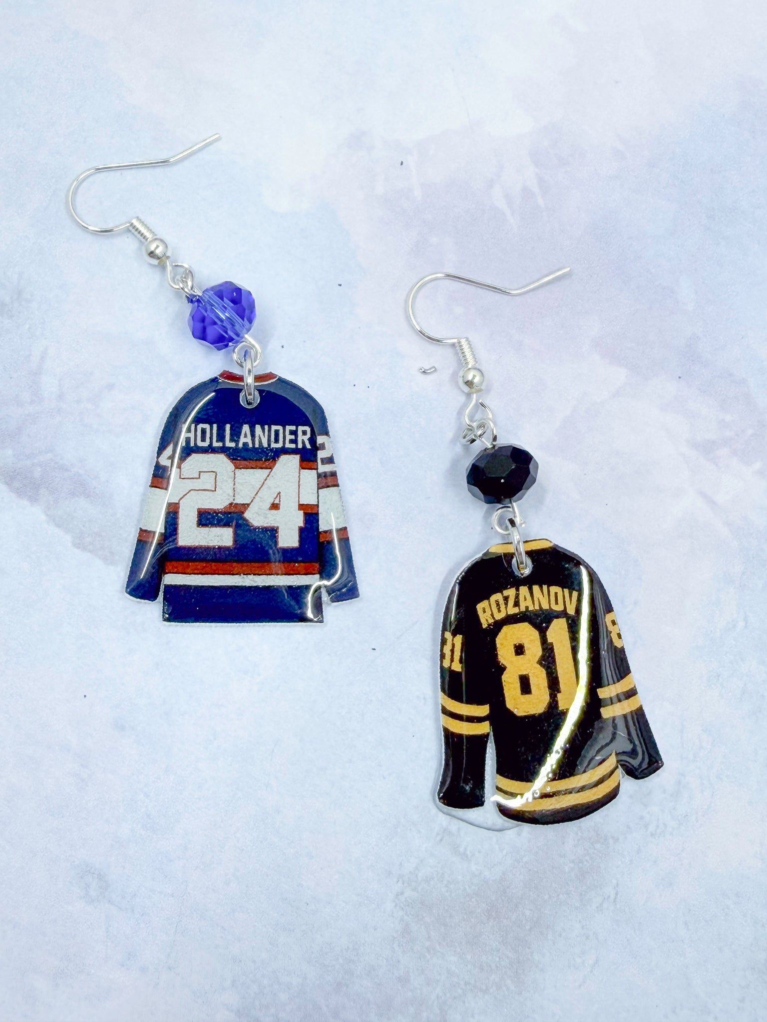 Show off your favorite hockey romance with these customizable earrings! Mix and match jerseys to represent your ultimate ship, or go all-in on a single team. Available with multiple hook styles so you can wear them comfortably all day long. Perfect for fans who wear their hearts—and their favorite pairings—on their ears.