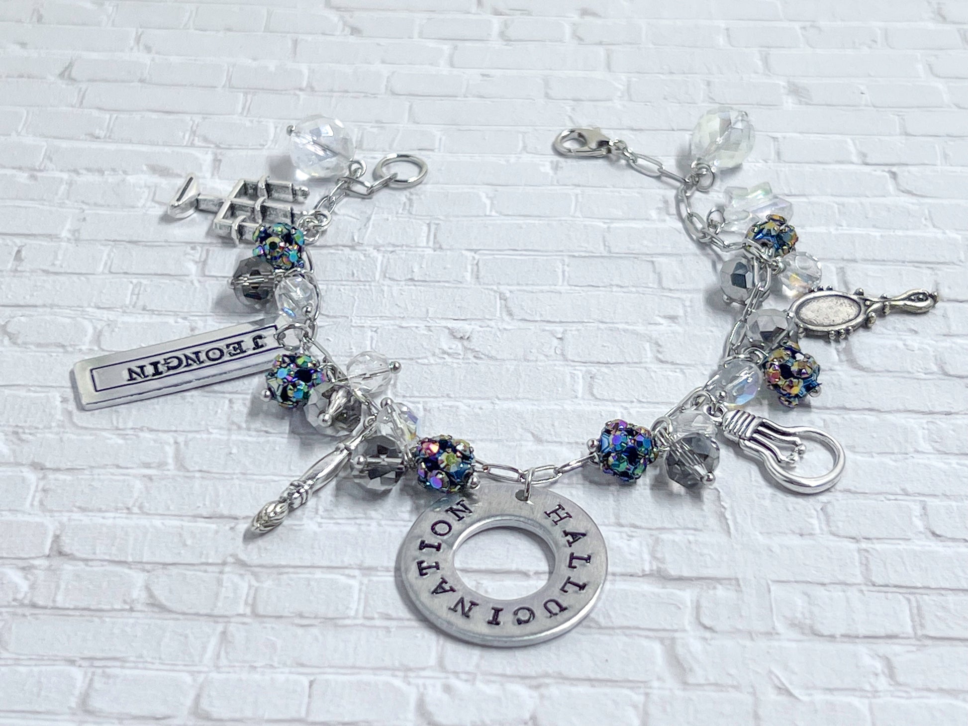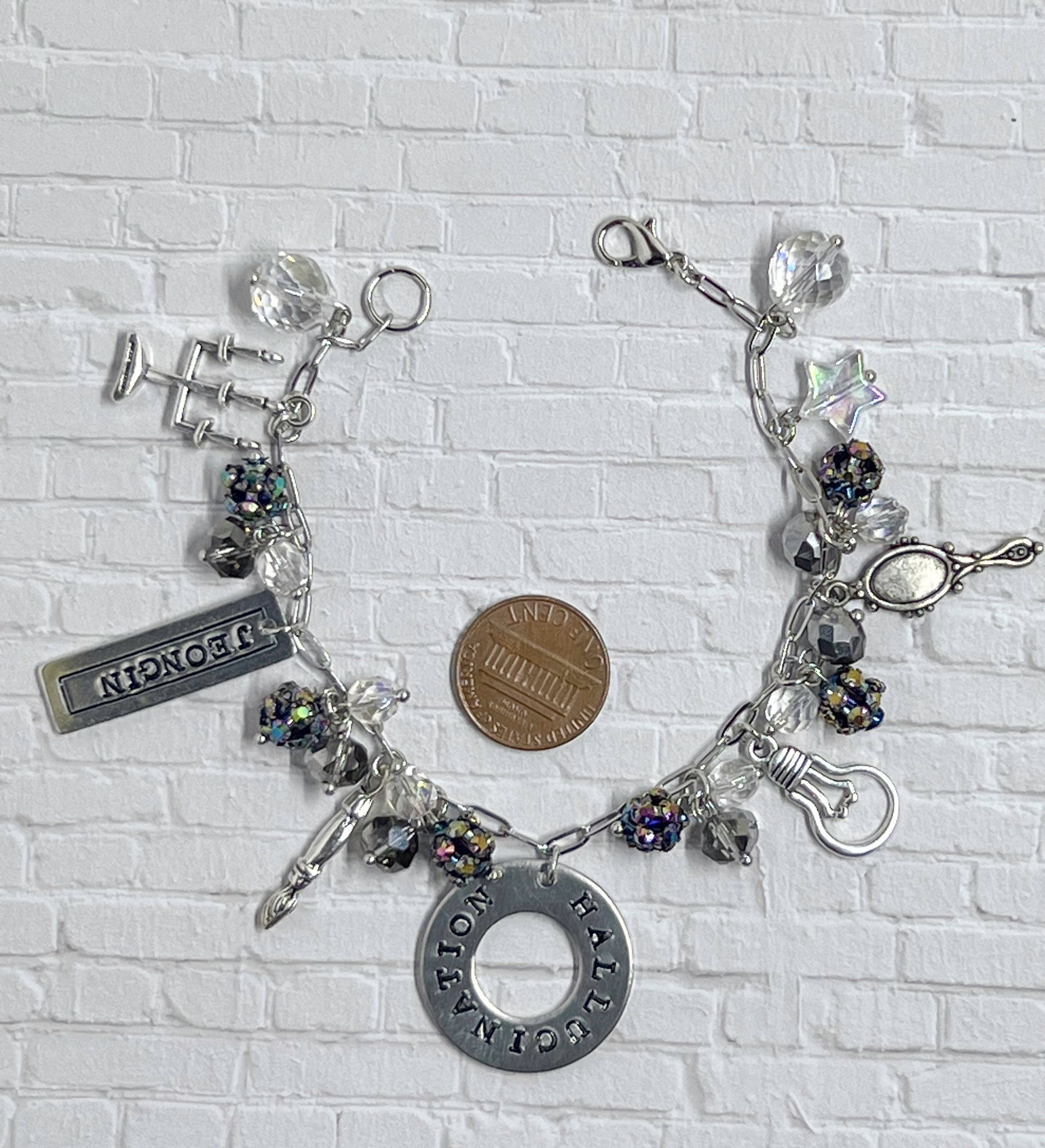 Inspired by I'N's solo song Hallucination. The bracelet has black and silver with multi colored beads the following charms: a paint brush, a lightbulb, a candle, a mirror, and a stamping blank of his name.