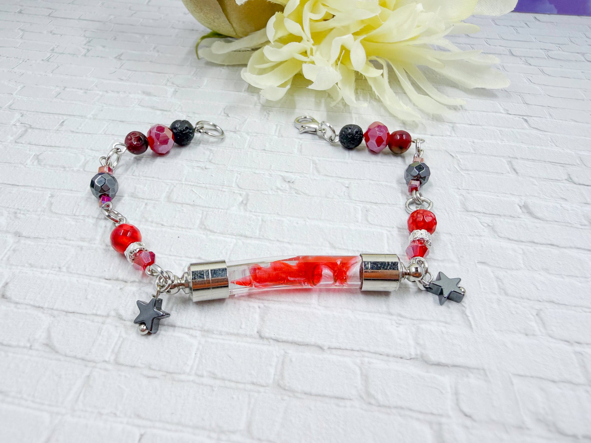 Slip on divine style with Lucifer's Grace Bottled Bracelet—a rosary-inspired wrist piece that brings spiritual flair to your everyday look. Adorned with gorgeous beads and crystals, this bracelet features a show-stopping resin centerpiece packed with shimmering glitter that catches the light beautifully. Currently styled in rich dark red, but we can customize the bead color to match your vibe. Explore our full angel collection and find your perfect supernatural Angel.