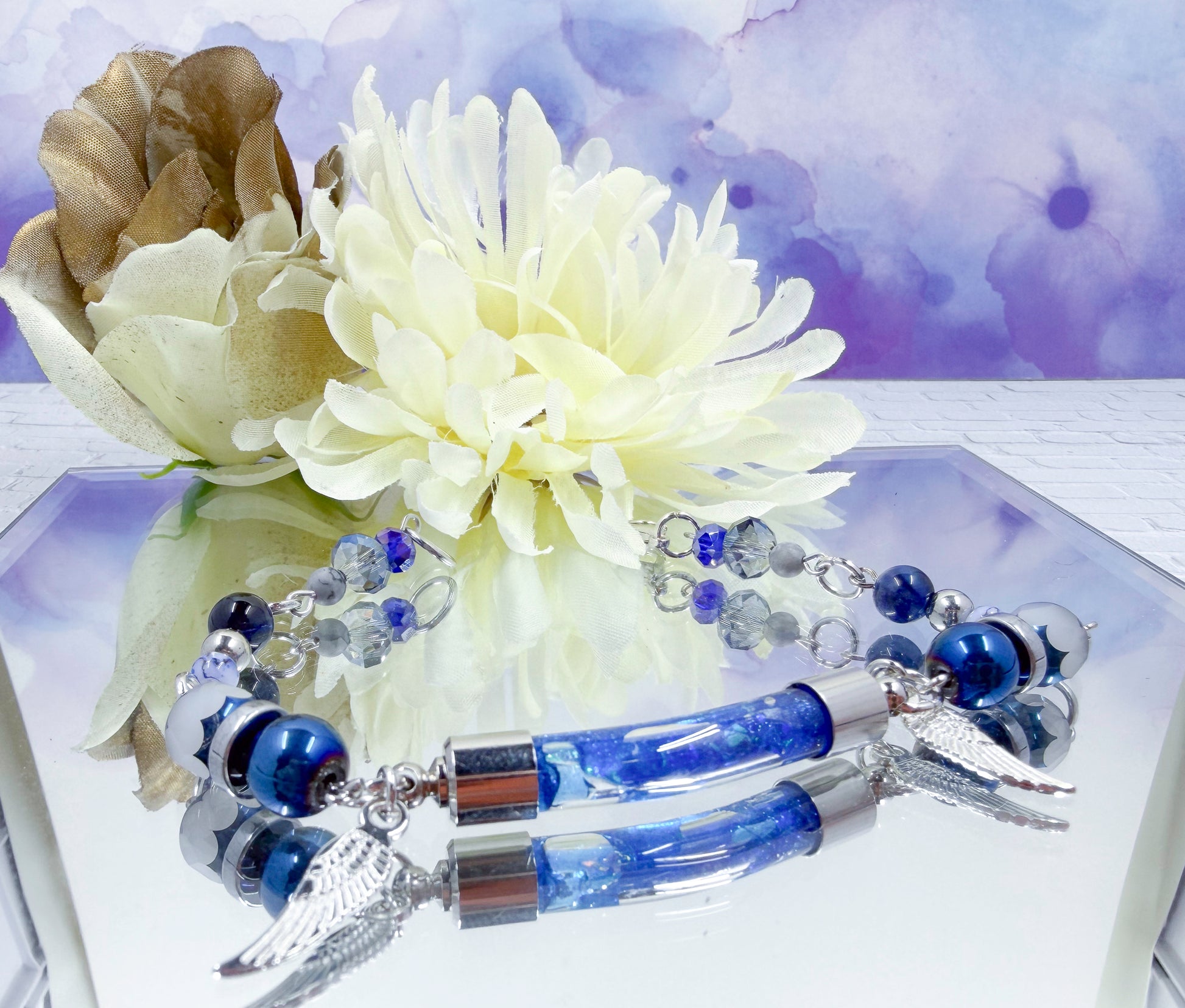 Slip on divine style with Michael's Grace Bottled Bracelet—a rosary-inspired wrist piece that brings spiritual flair to your everyday look. Adorned with gorgeous beads and crystals, this bracelet features a show-stopping resin centerpiece packed with shimmering glitter that catches the light beautifully. Currently styled in rich dark blue, but we can customize the bead color to match your vibe. Explore our full angel collection and find your perfect supernatural Angel