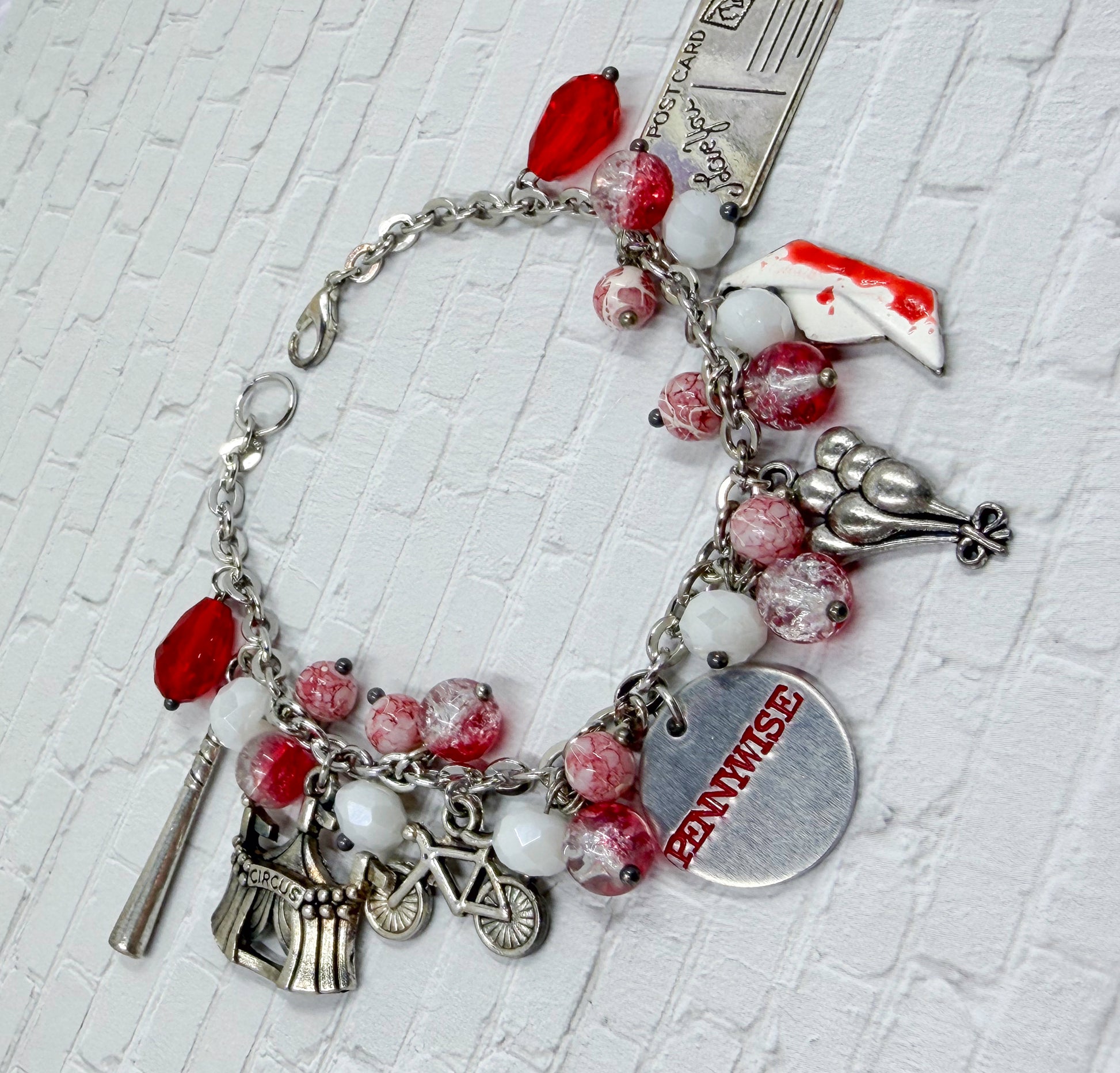 Slip on this wickedly fun Pennywise bracelet and join the Loser Club in style. Featuring charms inspired by the iconic clown, this playful piece celebrates your love for all things creepy and quirky. Perfect for horror fans, enthusiasts, and anyone brave enough to float with the best of them. Mix and match charms to customize your look and show off your fandom.