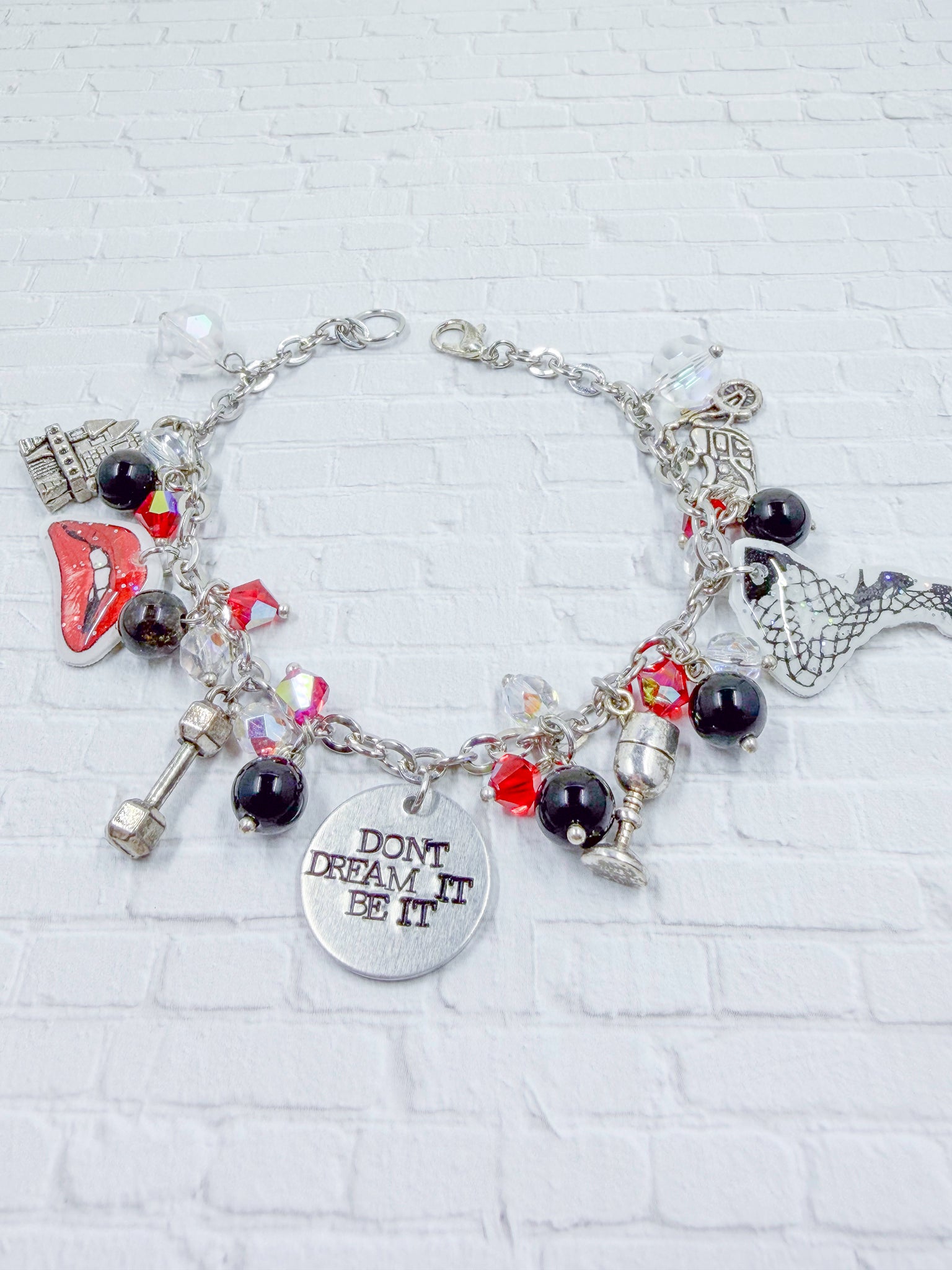 Calling all devotees of cult classics! This bracelet celebrates the iconic madness of Rocky Horror with a collection of charms that capture the film's most memorable moments—from the legendary cast to those unforgettable legs, lips, weights, a wine glass, and a motorcycle. Each charm is a tiny tribute to the show that never gets old. Perfect for fans who live for the midnight screenings and audience participation.