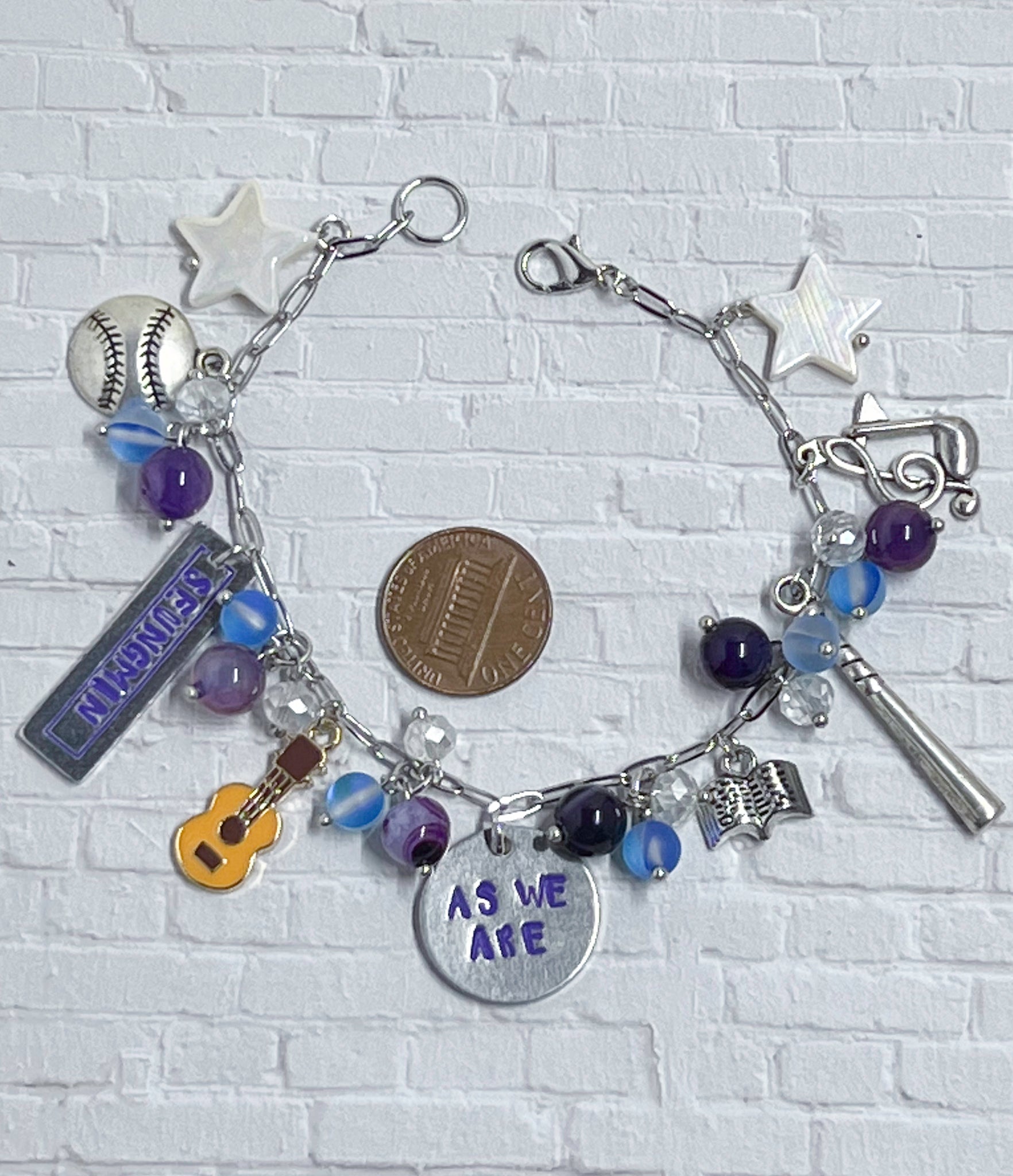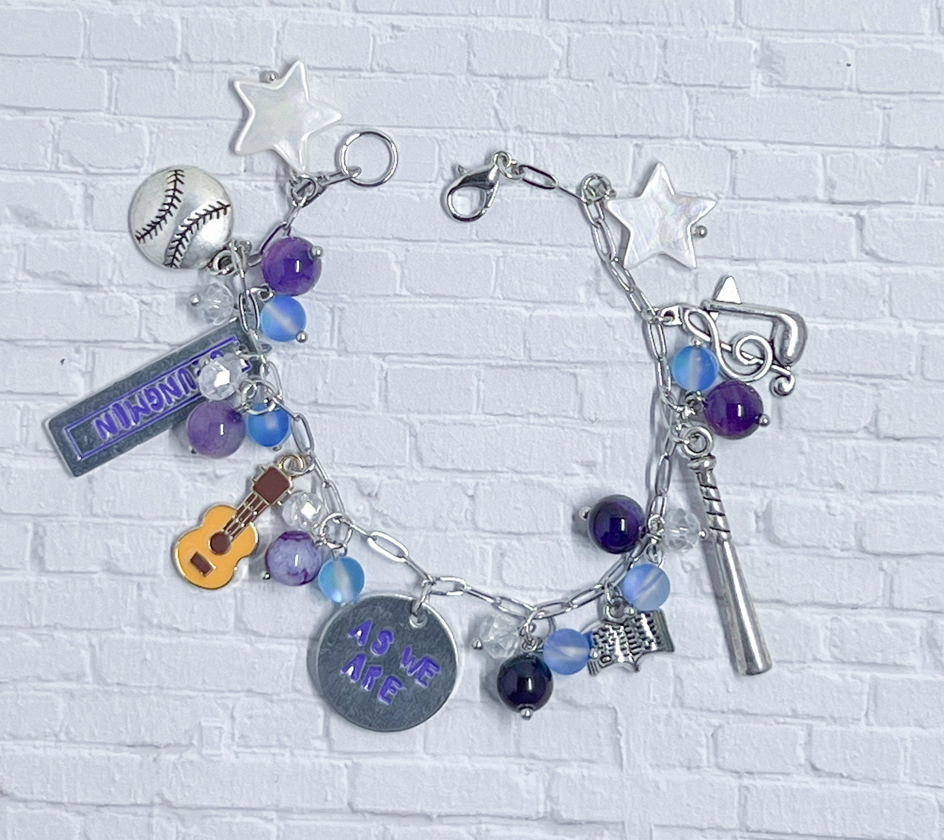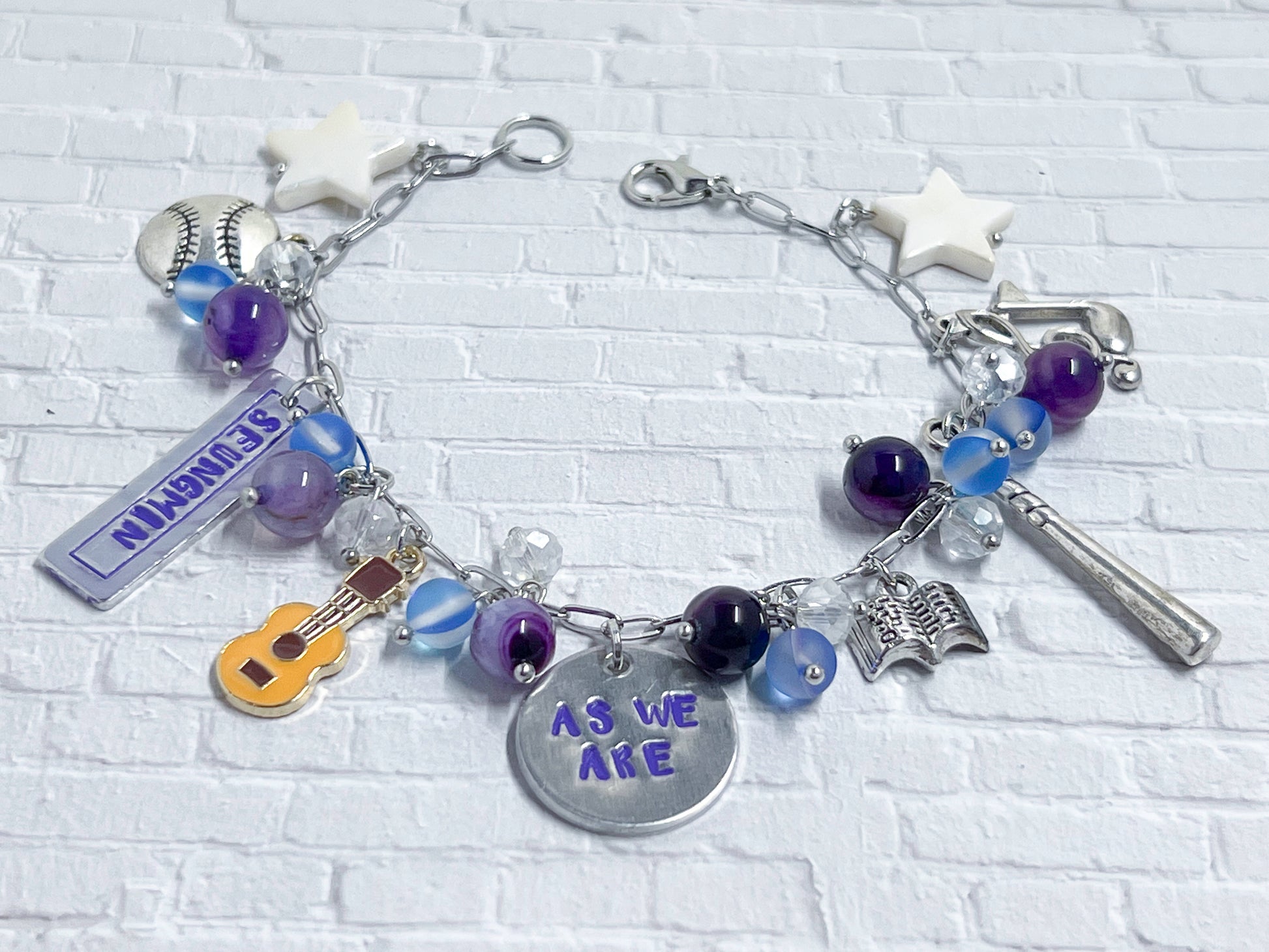 Inspired by Seungmin's solo song As We Are. The bracelet has purple and blue beads. The following charms: a guitar, a bat, a baseball, a book, a music note, and a stamping blank of his name.