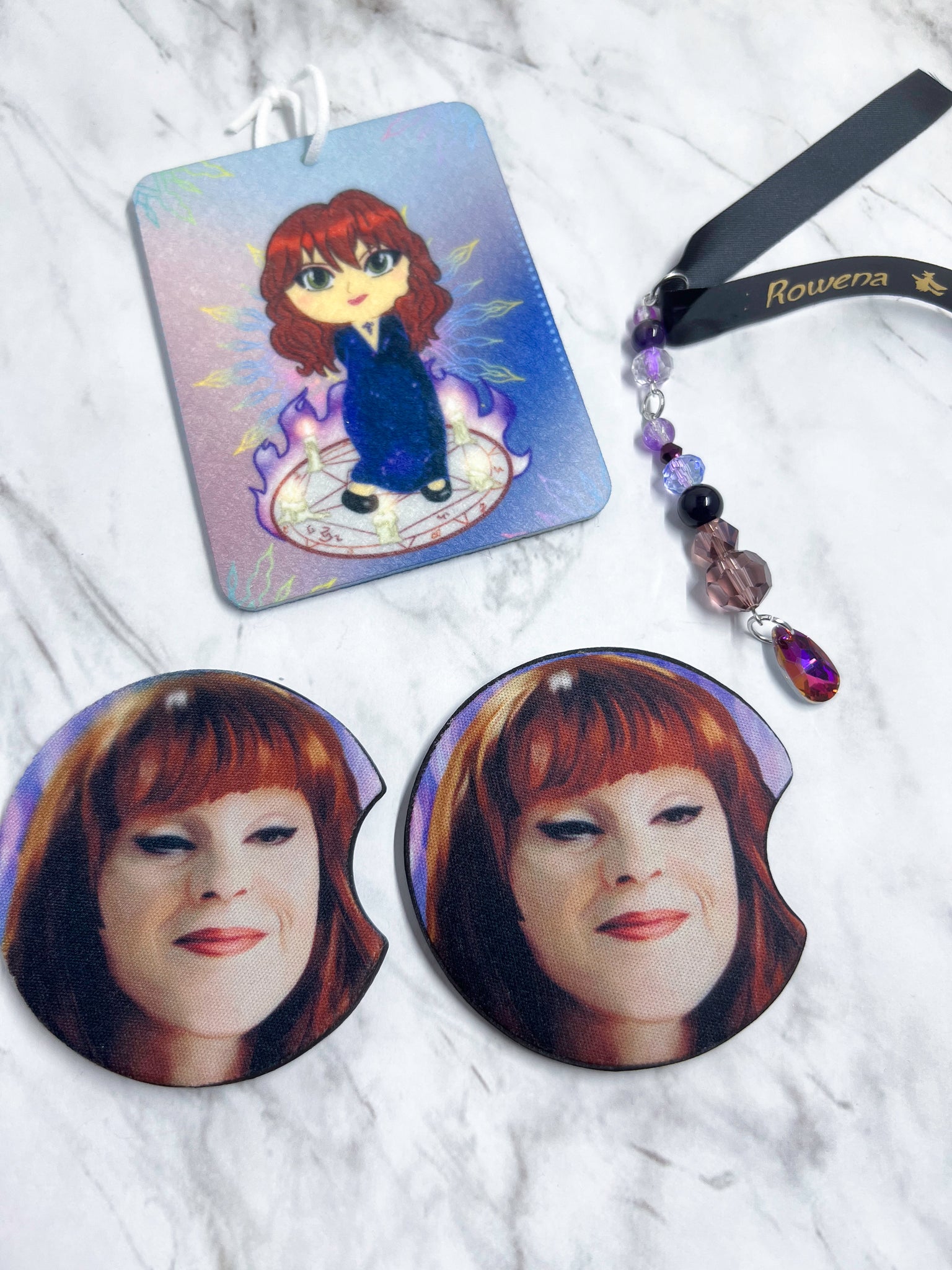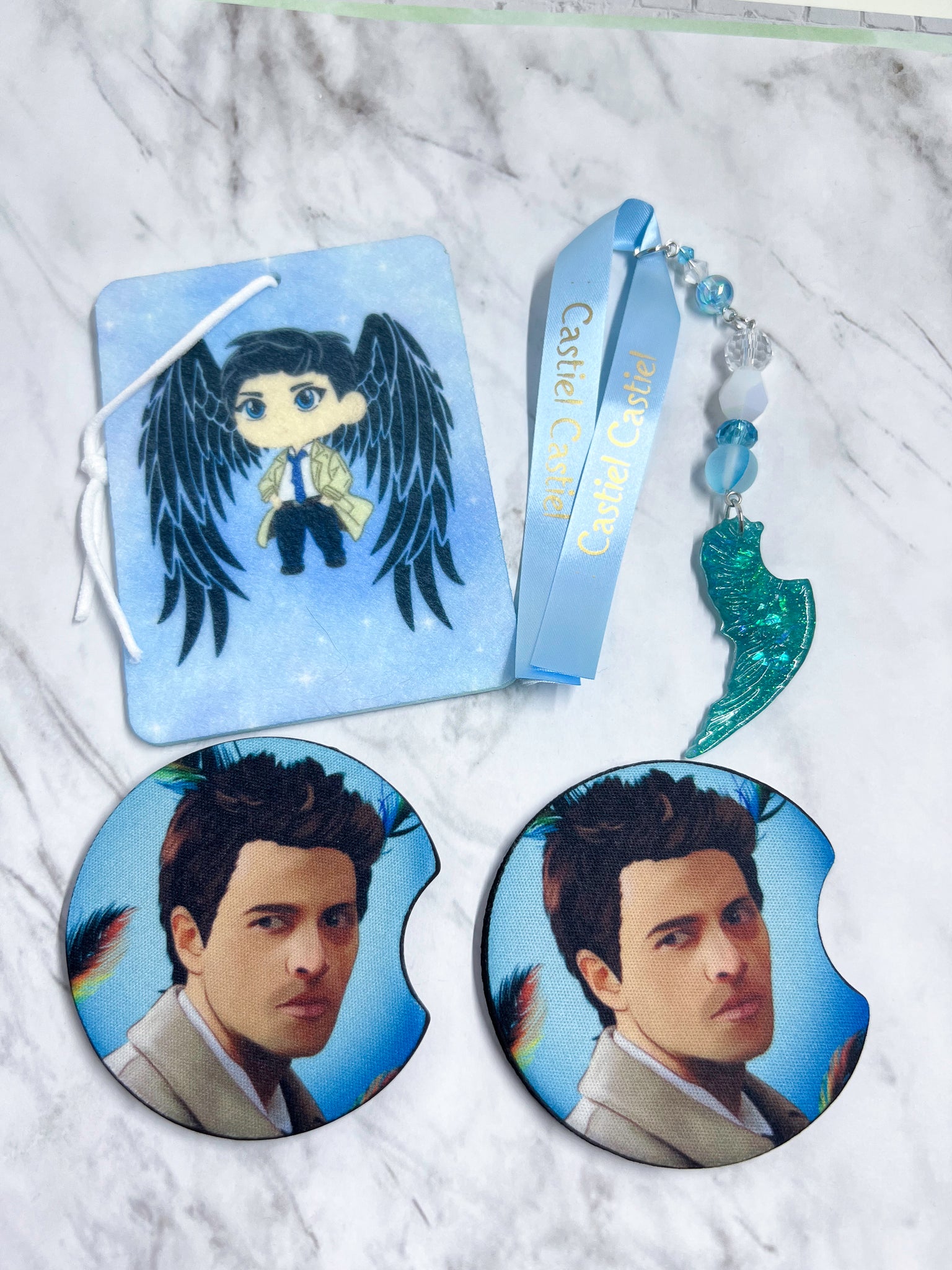 Supernatural Car Kits, come with two coasters for your car, an air freshener ( you can spray on your scent they are unscented until I have scent options in the future.), and a review mirror dangle.