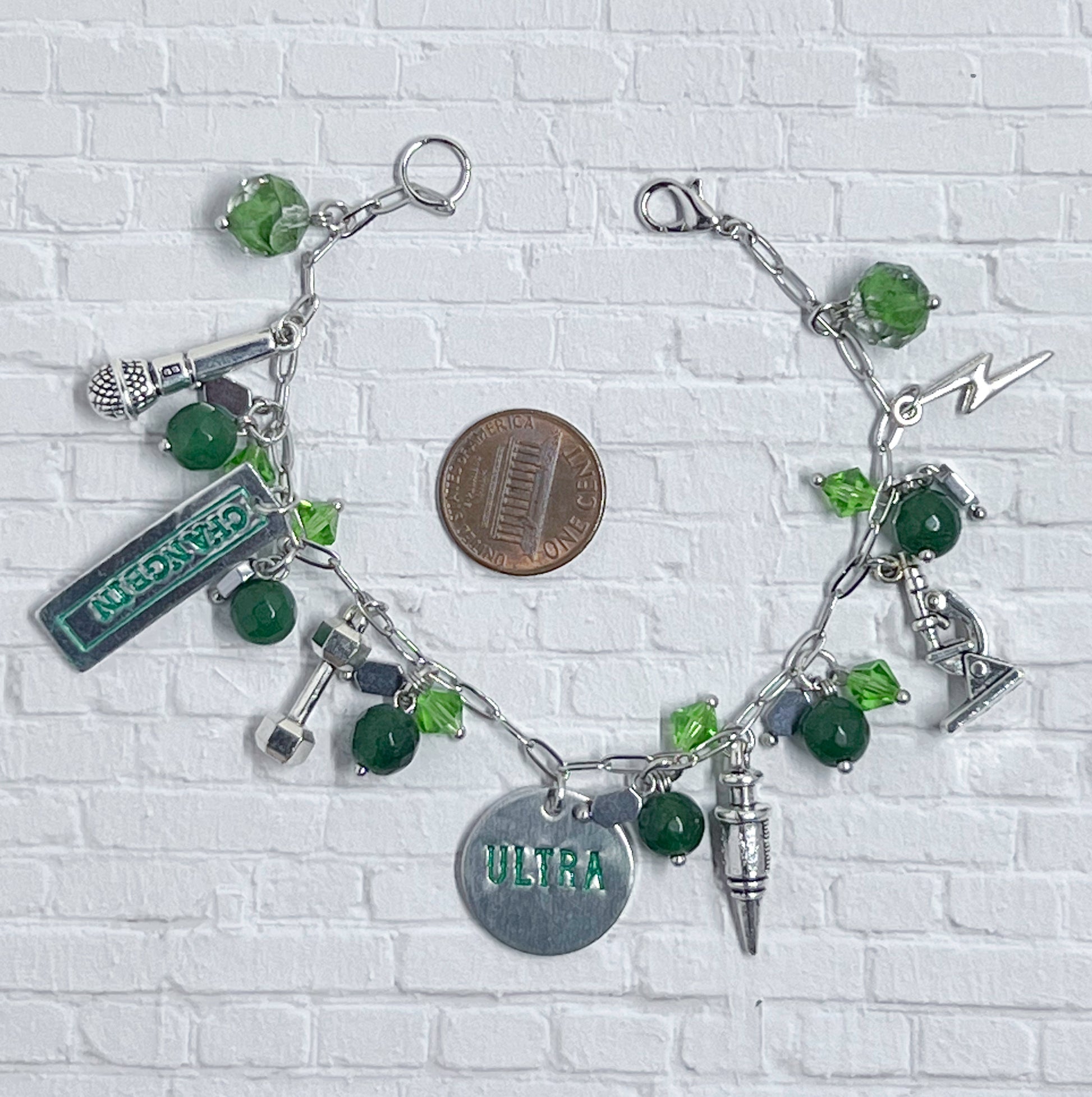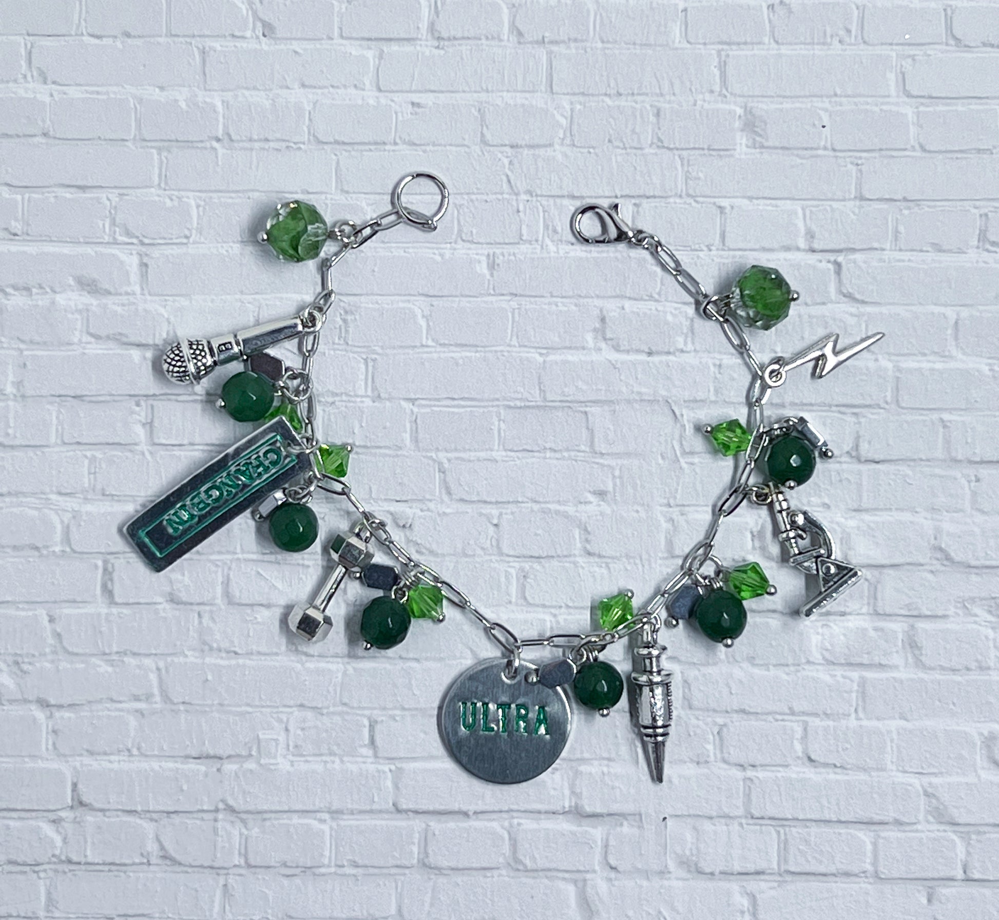 Inspired by Changbin's solo song Ultra. The bracelet has Green and silver with the following charms: lightning, a needle, a weight, a microscope, a mic, and a stamping blank of his name.